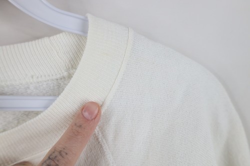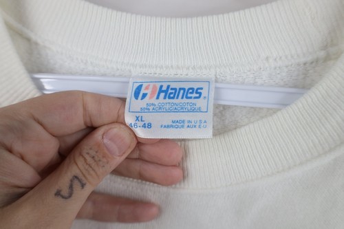 Stains front, collar. Collar, cuffs discolored. Yellowed. Graphics faded. Pilling. Made in USA