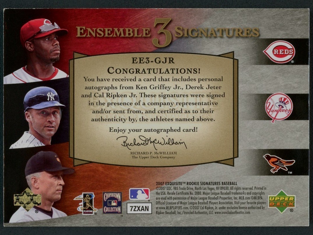 2007 Exquisite Ensemble 3 Ken Griffey Jr./Derek Jeter/Cal Ripken Jr. Auto #10/10