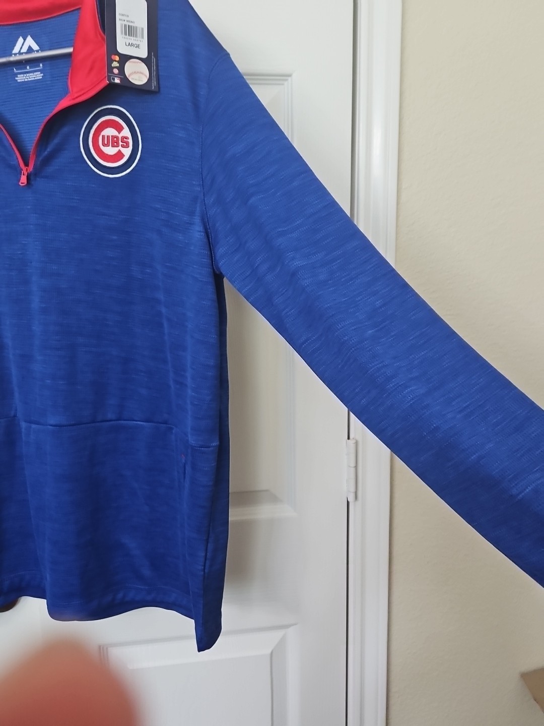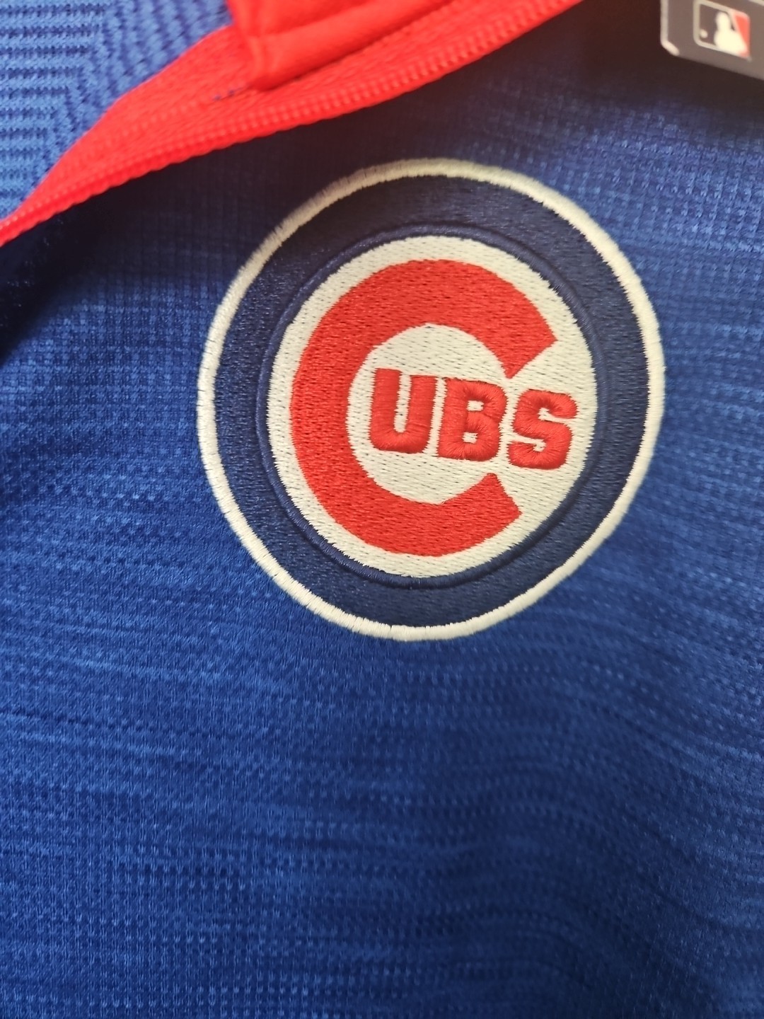 This Men's Large Chicago Cubs Majestic Baseball 1/4th zip Jersey is an officially licensed piece of fan apparel perfect for any baseball enthusiasts. Made in Indonesia, this blue jacket features the iconic Chicago Cubs team logo, making it a must-have for fans of the Major League Baseball team. The Majestic brand ensures high-quality and authenticity, making this jersey a great addition to any fan's collection. Whether you're heading to a game or simply want to show off your team spirit, this jersey is a stylish and comfortable option for any fan.