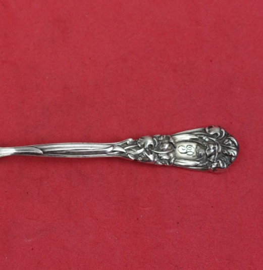 Sterling silver Strawberry Fork 3-Tine 5" in the pattern Iris by Durgin-Gorham. It is monogrammed (monos vary) and is in excellent condition.
