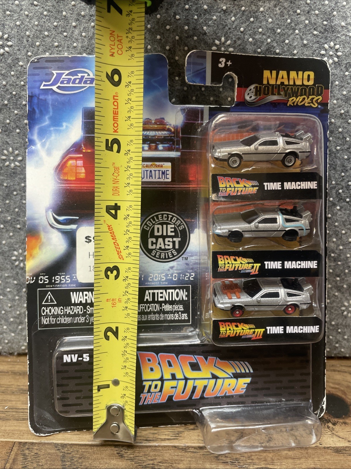 Back to the future, DeLorean nano Hollywood rides collectors diecast series featuring DeLorean from back to the future one two and three in unopened box with slight wear and tear from age otherwise good condition. See photos for details and measurements.