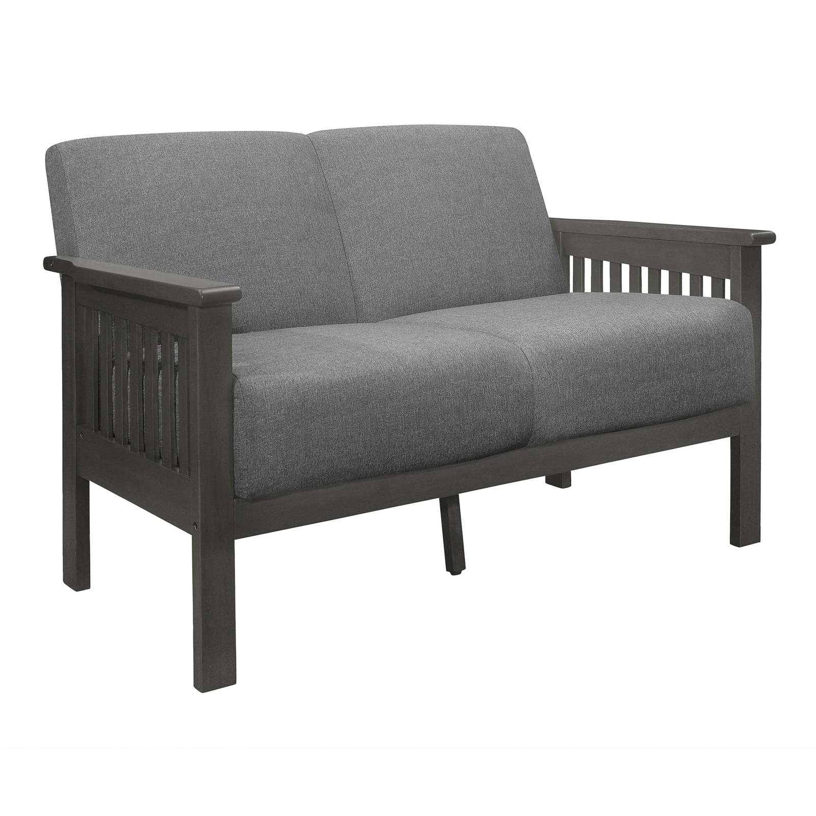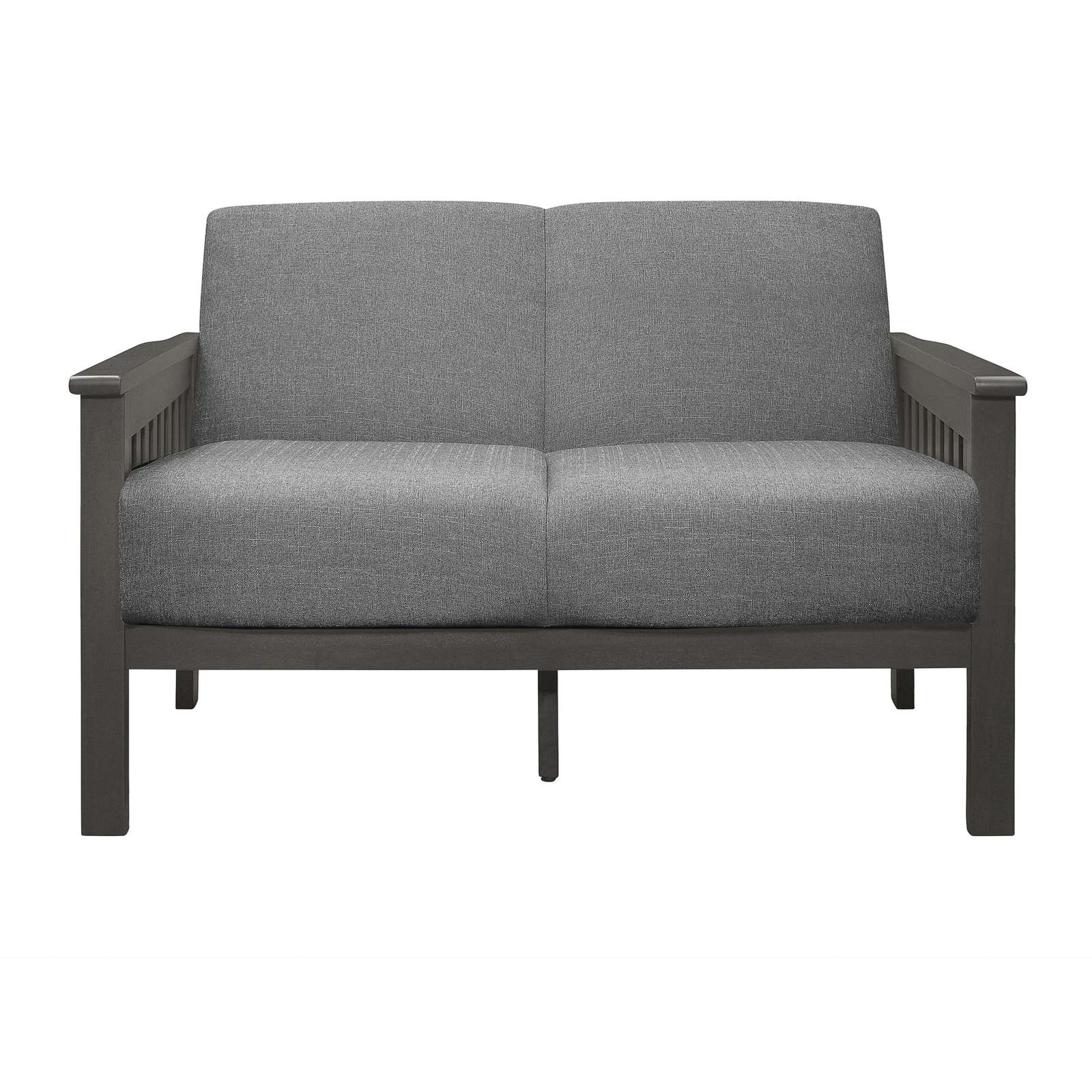 Designed with inspiration from the Arts Crafts movement, the Lewiston Collection will be a classic addition to your home?s decor. The love seat's transitionally styled legs and vertical slat-supported wood arms are finished in an antique gray, providing complementing contrast to the gray linen-like fabric covering.