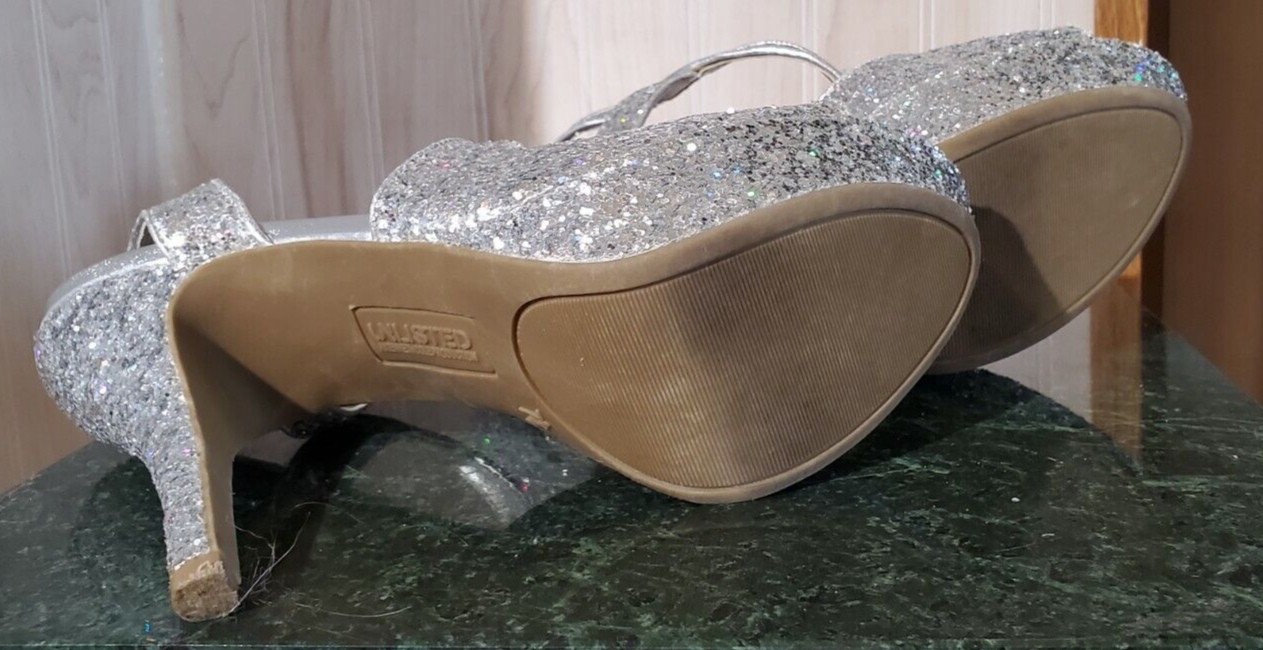 The Kenneth Cole My Hour Silver Stilettos are a pair of ultra-high heels with a glitter and rhinestone accent. They have an open toe and a buckle closure, making them perfect for parties and cocktail events. The shoes have a solid pattern and a metal theme, with a strappy style and a stiletto heel. The platform height is 1 1/4", and the shoe width is medium. These shoes are available in size 7.5 for both US and AU shoe sizes, and UK shoe size 5.