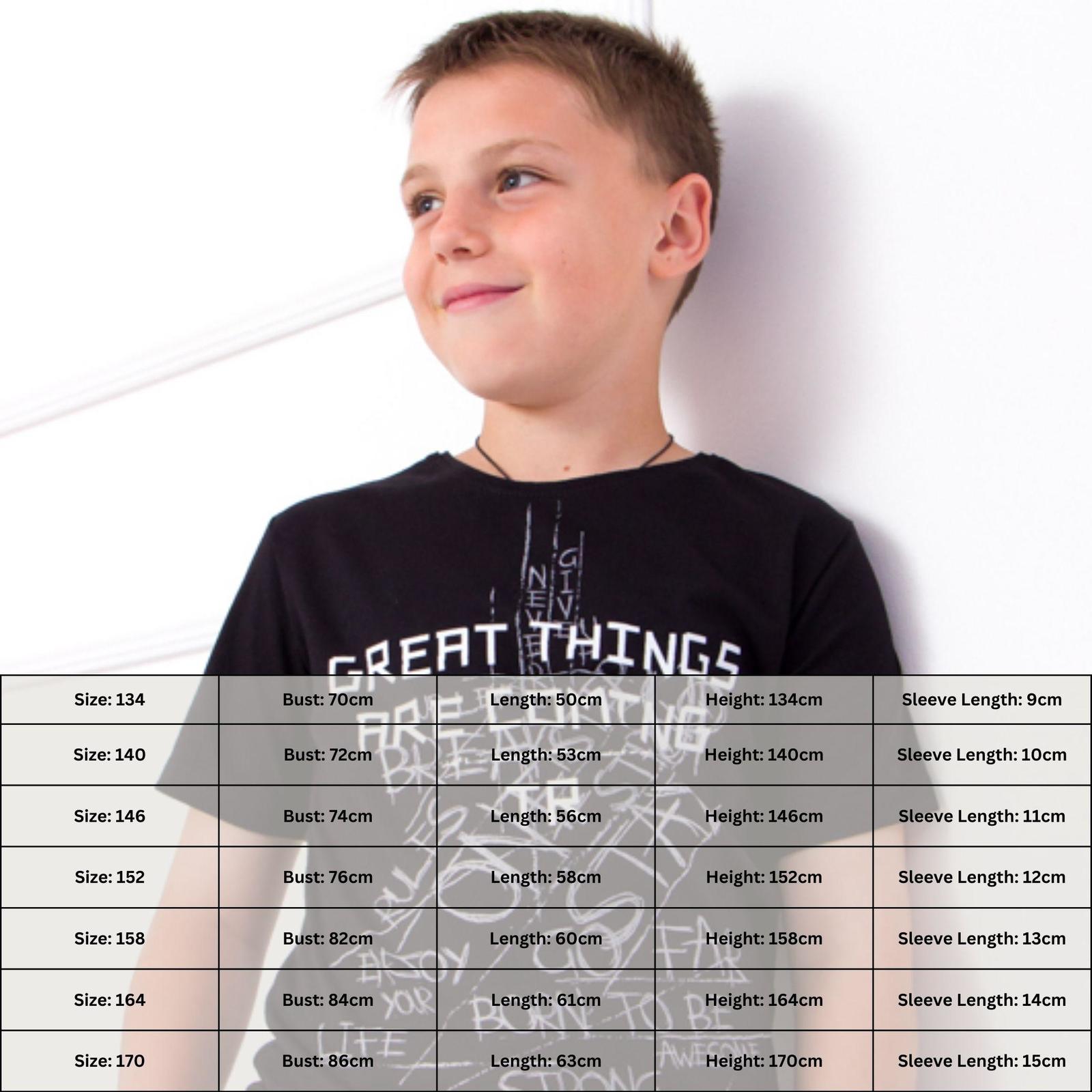 The boys' teen T-shirt is the perfect choice for an active and stylish look. Made from high-quality cotton, it offers comfort and breathability. The model features a standard straight cut, short sleeves, and a round neckline, making it easy to pair with shorts, jeans, or sweatpants. Available in various colors and with a trendy design. Easy to care for: wash at temperatures up to 30C to maintain vibrant colors and shape.