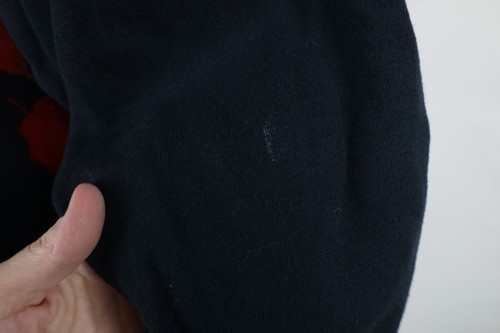 Stains arms, back. Blemish front right of collar. Graphics faded. Color faded. Has pilling. USA made