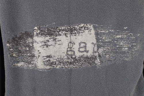 Collar, cuffs, armpits discolored. Graphics faded. Color faded