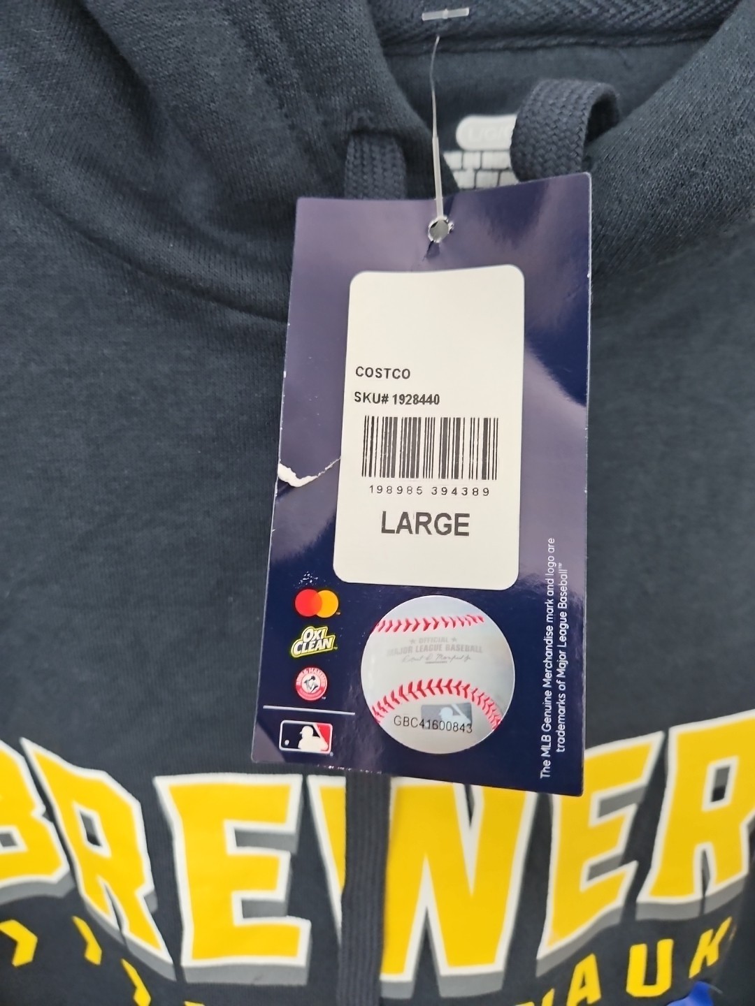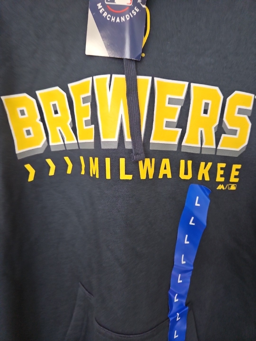The product is an authentic men's Milwaukee Brewers hoodie by Majestic, featuring the team's logo and colors. It is officially licensed by Major League Baseball and is perfect for fans of the Milwaukee Brewers. The hoodie is in size Large and is a great addition to any baseball fan's collection, representing the team during the regular season. Made in Thailand, this hoodie is designed for men and is the perfect way to show support for the Milwaukee Brewers.