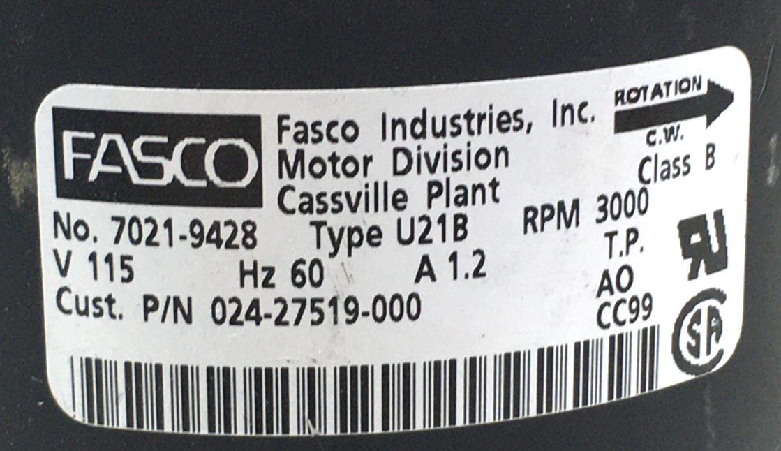 This is FASCO 7021-9428 Furnace Draft Inducer Blower Motor 024-27519-000 115V 3000 RPM used part.