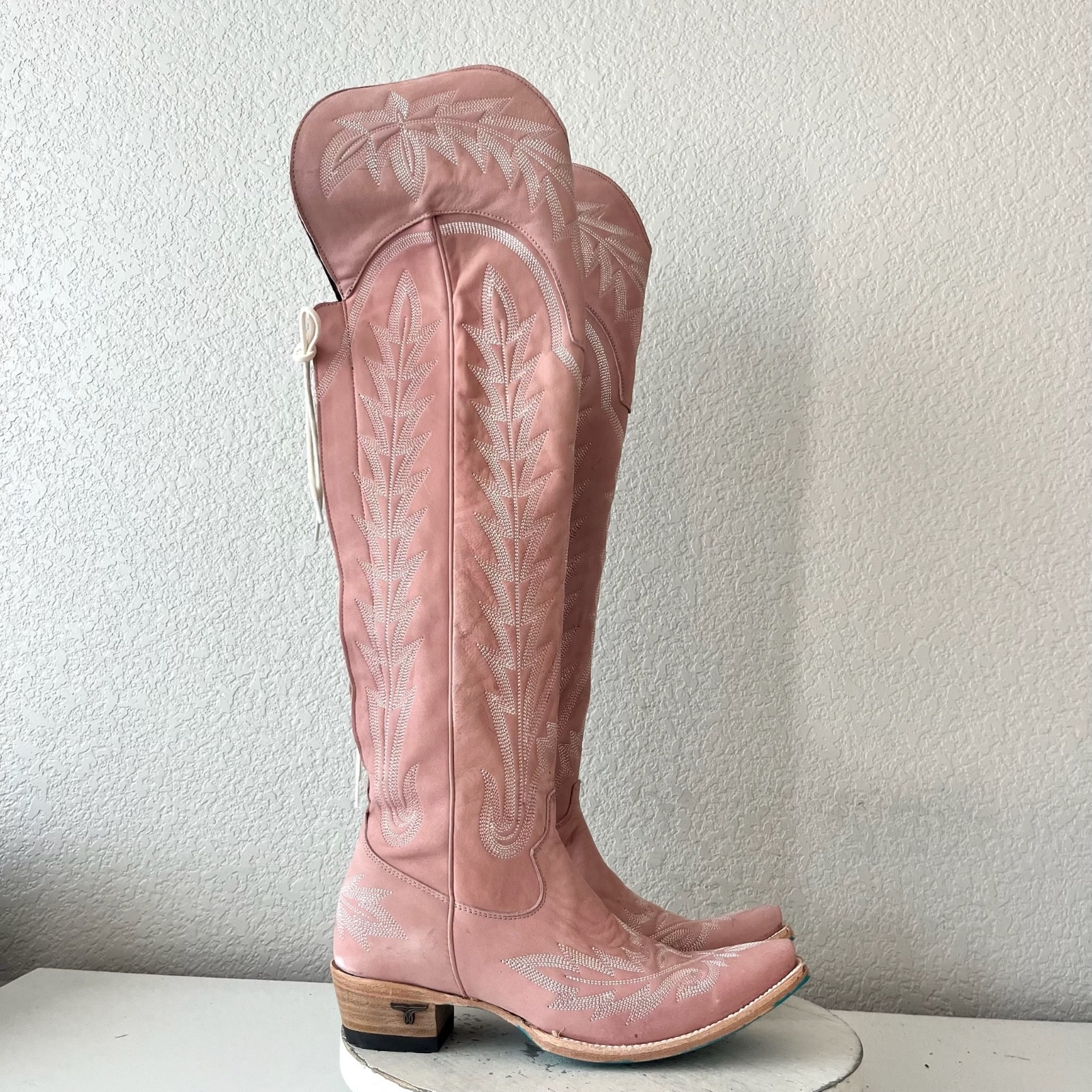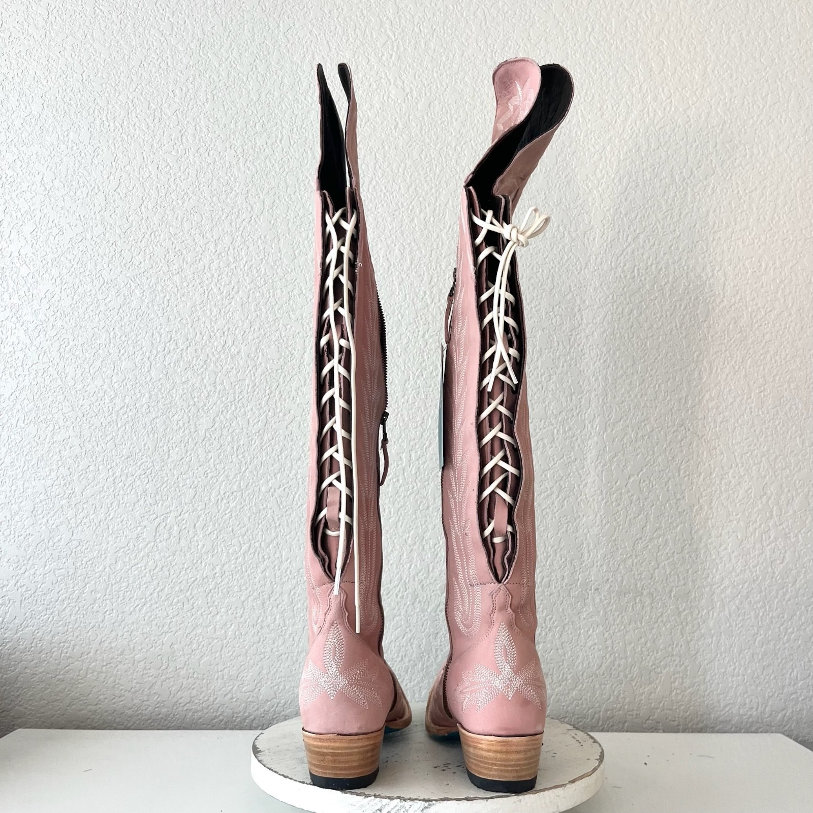 Lane LEXINGTON Over The Knee Womens Cowboy Boots in Blush Pink leather with a Western Snip Toe and Adjustable Corset that is Wide calf friendly.