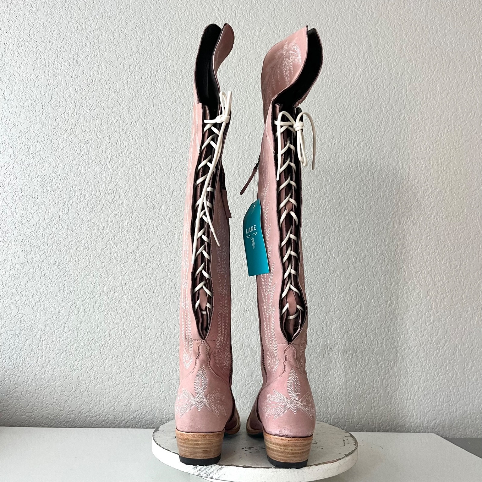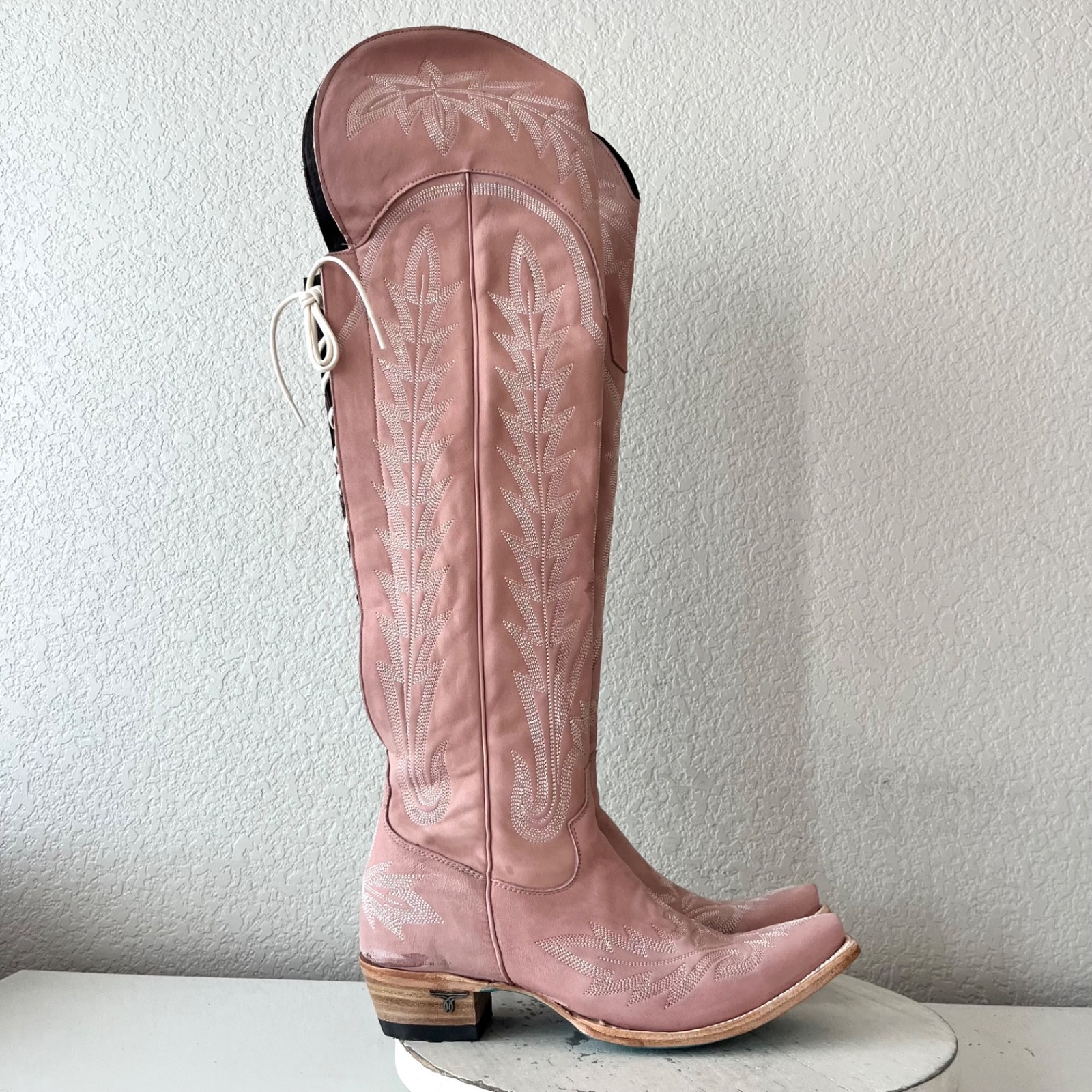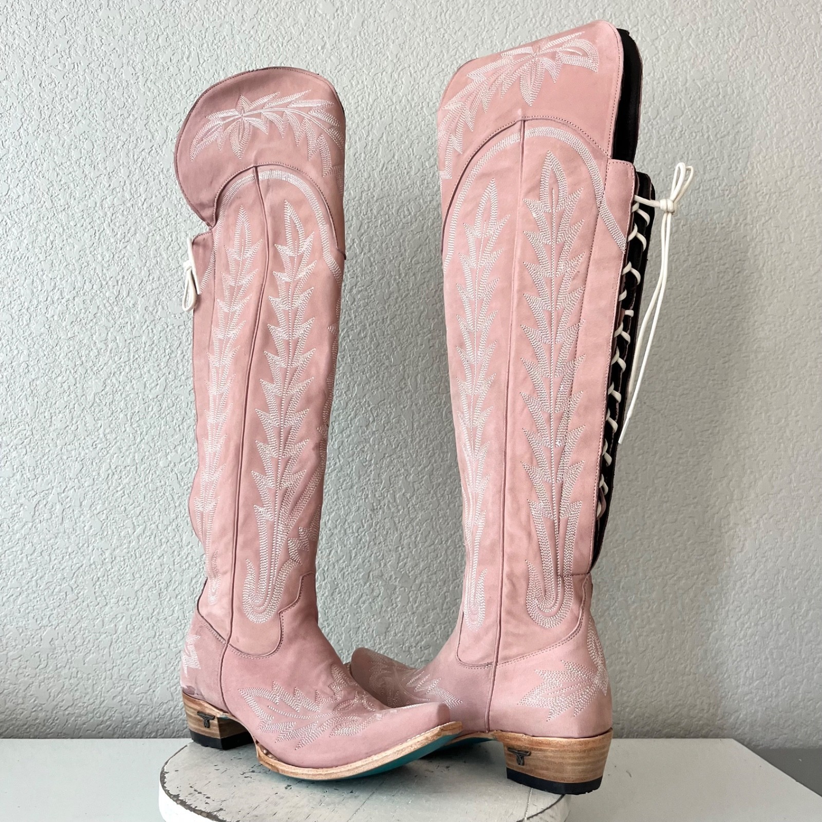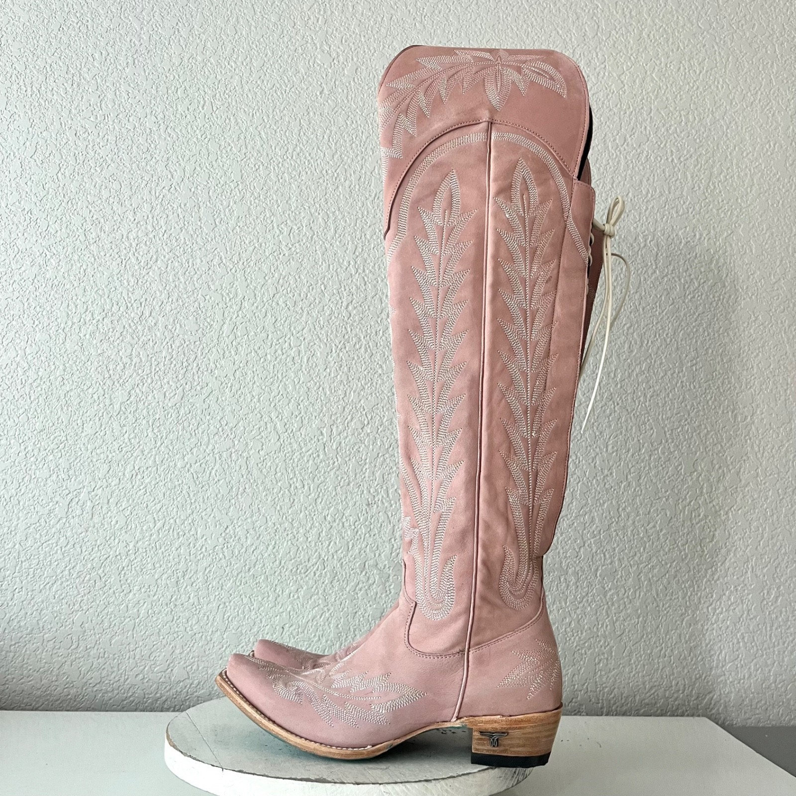 Lane LEXINGTON Over The Knee Womens Cowboy Boots in Blush Pink leather with a Western Snip Toe and Adjustable Corset that is Wide calf friendly.