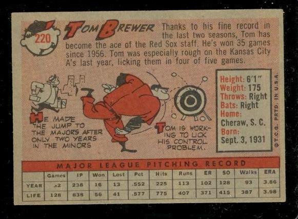 Vintage 1958 Topps Baseball Trading Card #220 Tom Brewer Boston Red Sox Pitcher. Raw and ungraded. Smoke and pet free.