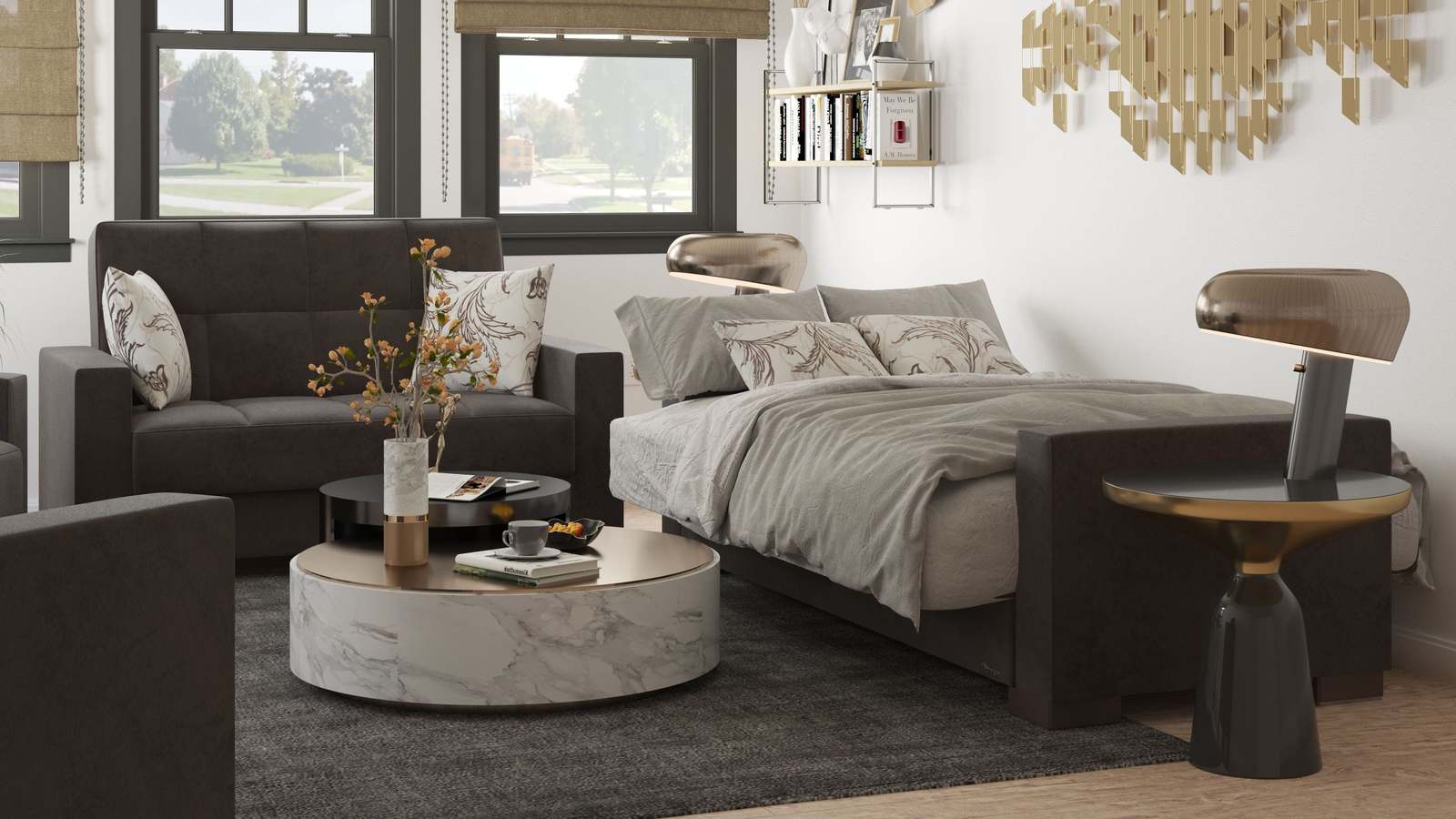 FASHIONABLY CONVENIENT: With one swift motion, transform this Sofabed into a sleeper that measures in at 74? x 47.2? or utilize the included storage compartments for your very own storage needs. ASSEMBLY made easy in 30 minutes or less! DISCLAIMER: ITEMS IN IMAGES SOLD SEPARATELY