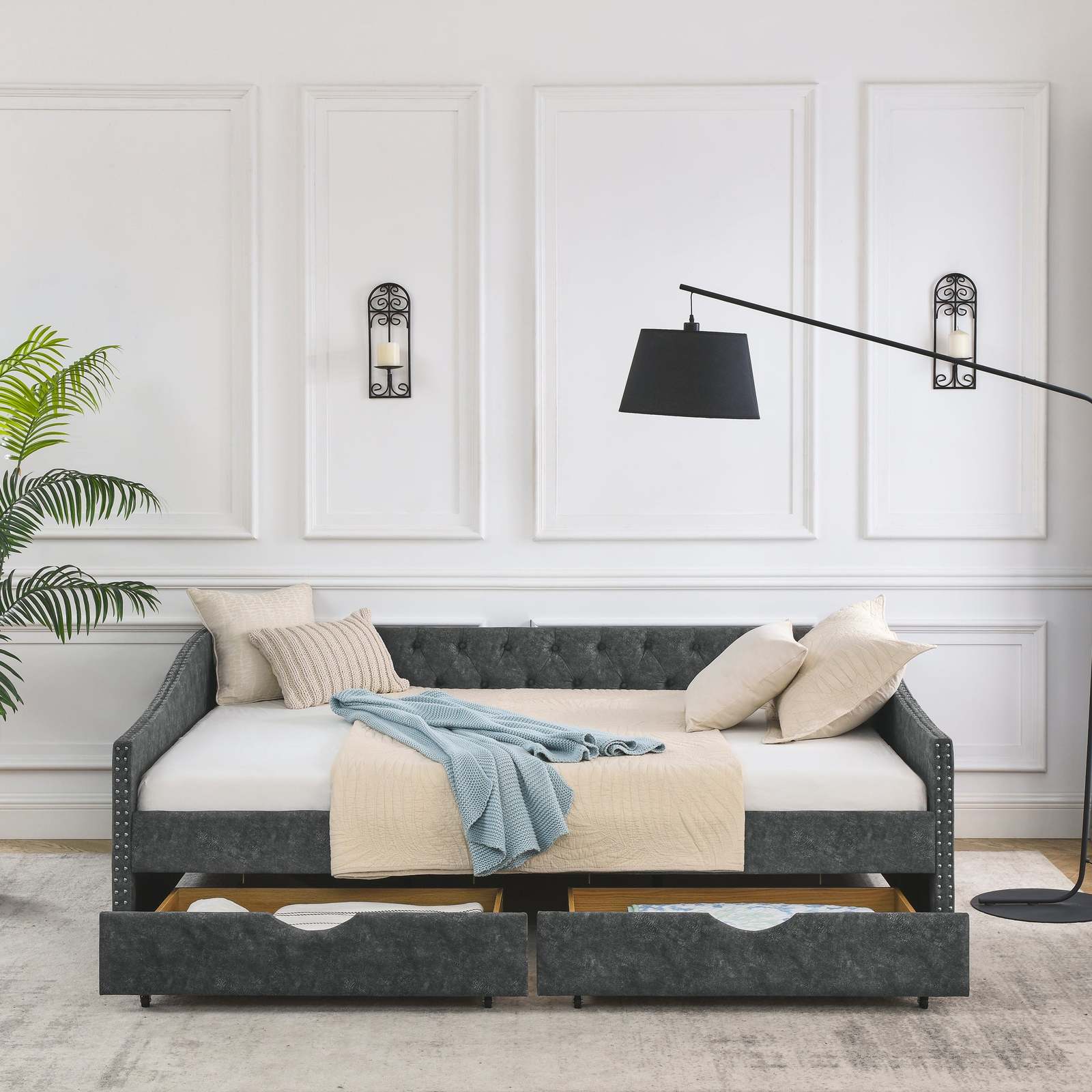 [ Functional Trundle] This exceptional piece of living room furniture is manufactured to meet your needs, allowing the cozy bed to not only afford a comfortable seating experience but also two drawers under the bed provide storage function. Reinforced Frame. The frame of this daybed with drawers is crafted from a combination of eucalyptus wood and MDF board to effortlessly hold up to 500lbs.