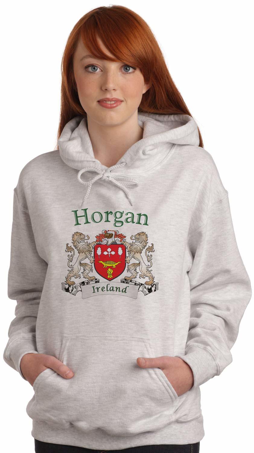 Product description: Horgan Irish Coat of Arms Hooded Sweatshirt in AshEvery Irish family has a story to tell-probably hundreds of stories. Your Irish coat-of-arms is a visual record of your family's oldest, most significant stories. Here, they're told in bright, four color permanent artwork on these fine-quality ash hooded Sweatshirts. Imprinted USA. Authentic Irish Family Coat of Arms. Over 25 years of Heraldry Research. 8.0 oz., 50/50 cotton/polyester. Printed with four color permanent process(no cracking or peeling-guaranteed). Choose from over 1000 available family coat of arms.