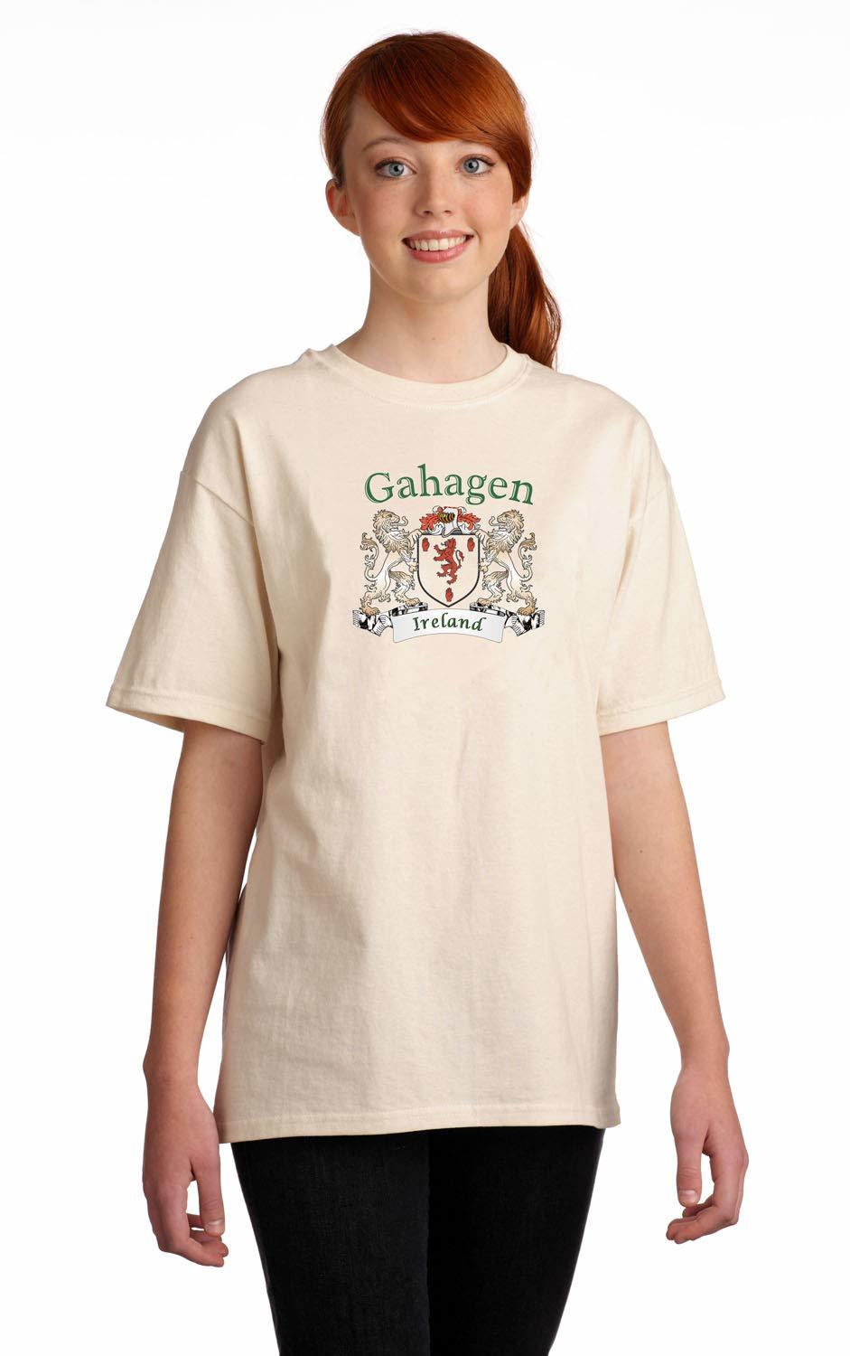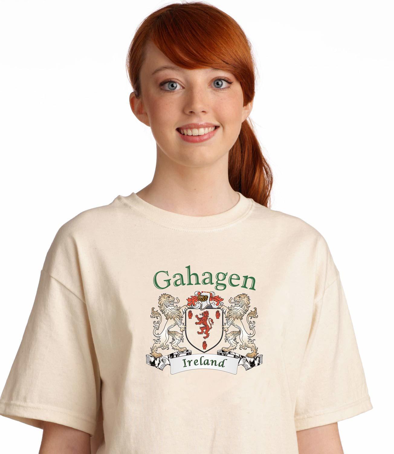 Product description: Gahagen Irish Coat of Arms Tee Shirt in NaturalEvery Irish family has a story to tell, probably hundreds of stories. Your Irish coat of arms is a visual record of your family's oldest, most significant stories. Here, they're told in bright, permanent artwork on these fine-quality, all-cotton tee shirts. Authentic Irish Family Coat of Arms 100% Cotton Gildan Tee Shirt Over 25 years of Heraldry Research Printed with four color permanent process(no cracking or peeling-guaranteed) Choose from over 1000 available family coat of arms.