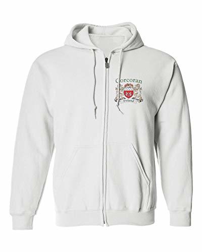 Product description: Corcoran Irish Coat of Arms Full Zip Hoodie - White. Every Irish family has a story to tell-probably hundreds of stories. Your Irish coat-of-arms is a visual record of your family's oldest, most significant stories. Here, they're told in bright, permanent artwork on these fine-quality, 50/50 cotton/poly hooded Sweatshirt. Choose from over 1000 available family coat of arms. Imprinted USA.
