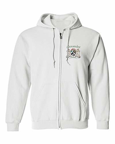 Alexander Irish Coat of Arms Full Zip Hoodie - White. Every Irish family has a story to tell-probably hundreds of stories. Your Irish coat-of-arms is a visual record of your family's oldest, most significant stories. Here, they're told in bright, permanent artwork on these fine-quality, 50/50 cotton/poly hooded Sweatshirt. Choose from over 1000 available family coat of arms. Imprinted USA.