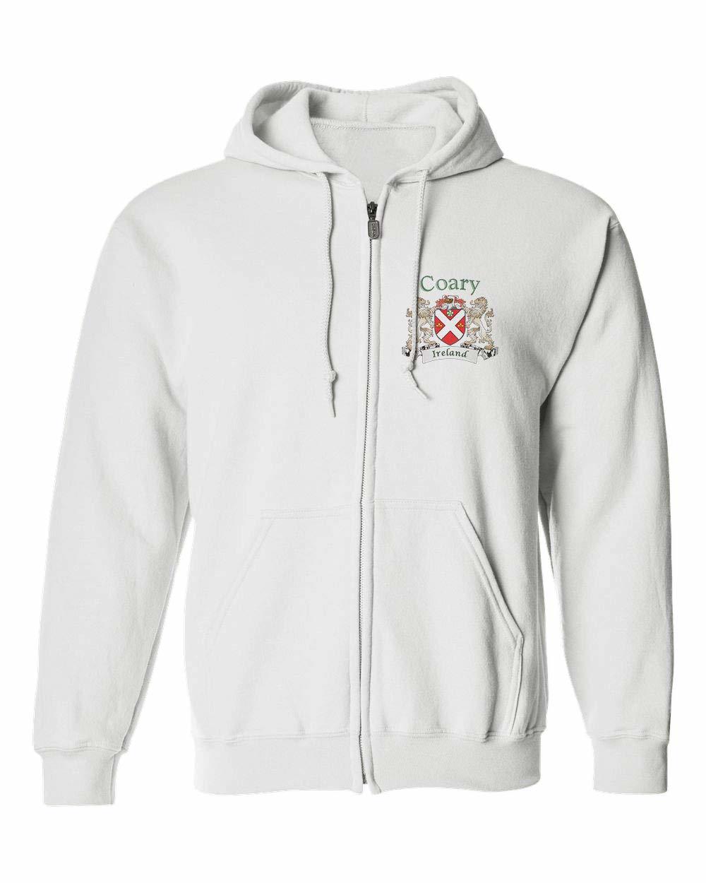 Coary Irish Coat of Arms Full Zip Hoodie - White. Every Irish family has a story to tell-probably hundreds of stories. Your Irish coat-of-arms is a visual record of your family's oldest, most significant stories. Here, they're told in bright, permanent artwork on these fine-quality, 50/50 cotton/poly hooded Sweatshirt. Choose from over 1000 available family coat of arms. Imprinted USA.