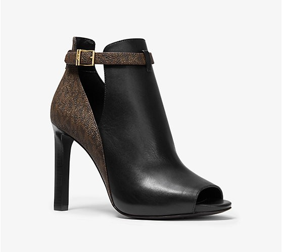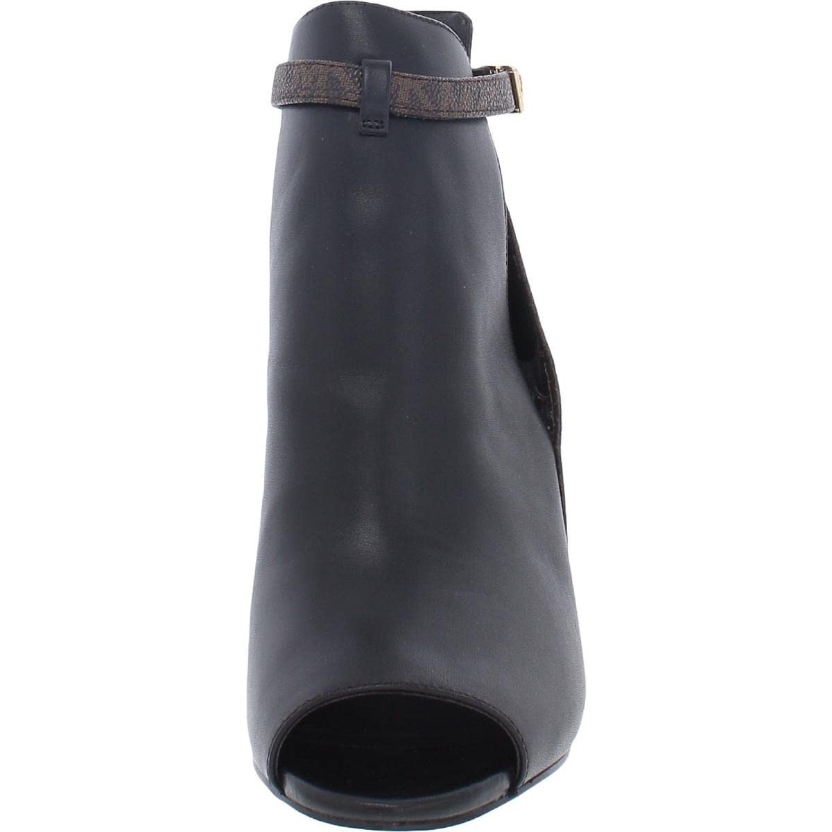 Michael Kors Lawson Open Toe Black Leather Brown Signature Logo Boot 8 M NEW