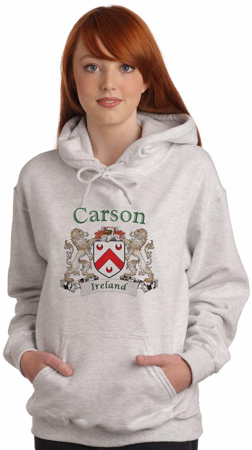 Product description: Carson Irish Coat of Arms Hooded Sweatshirt in AshEvery Irish family has a story to tell-probably hundreds of stories. Your Irish coat-of-arms is a visual record of your family's oldest, most significant stories. Here, they're told in bright, four color permanent artwork on these fine-quality ash hooded Sweatshirts. Imprinted USA. Authentic Irish Family Coat of Arms. Over 25 years of Heraldry Research. 8.0 oz., 50/50 cotton/polyester. Printed with four color permanent process(no cracking or peeling-guaranteed). Choose from over 1000 available family coat of arms.