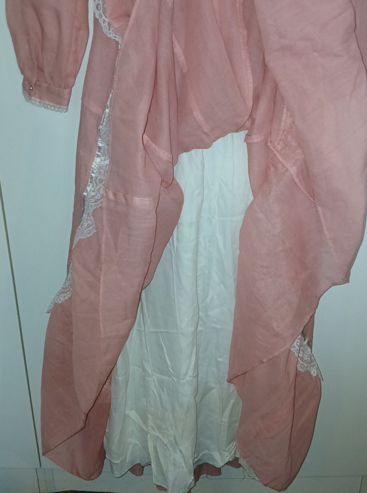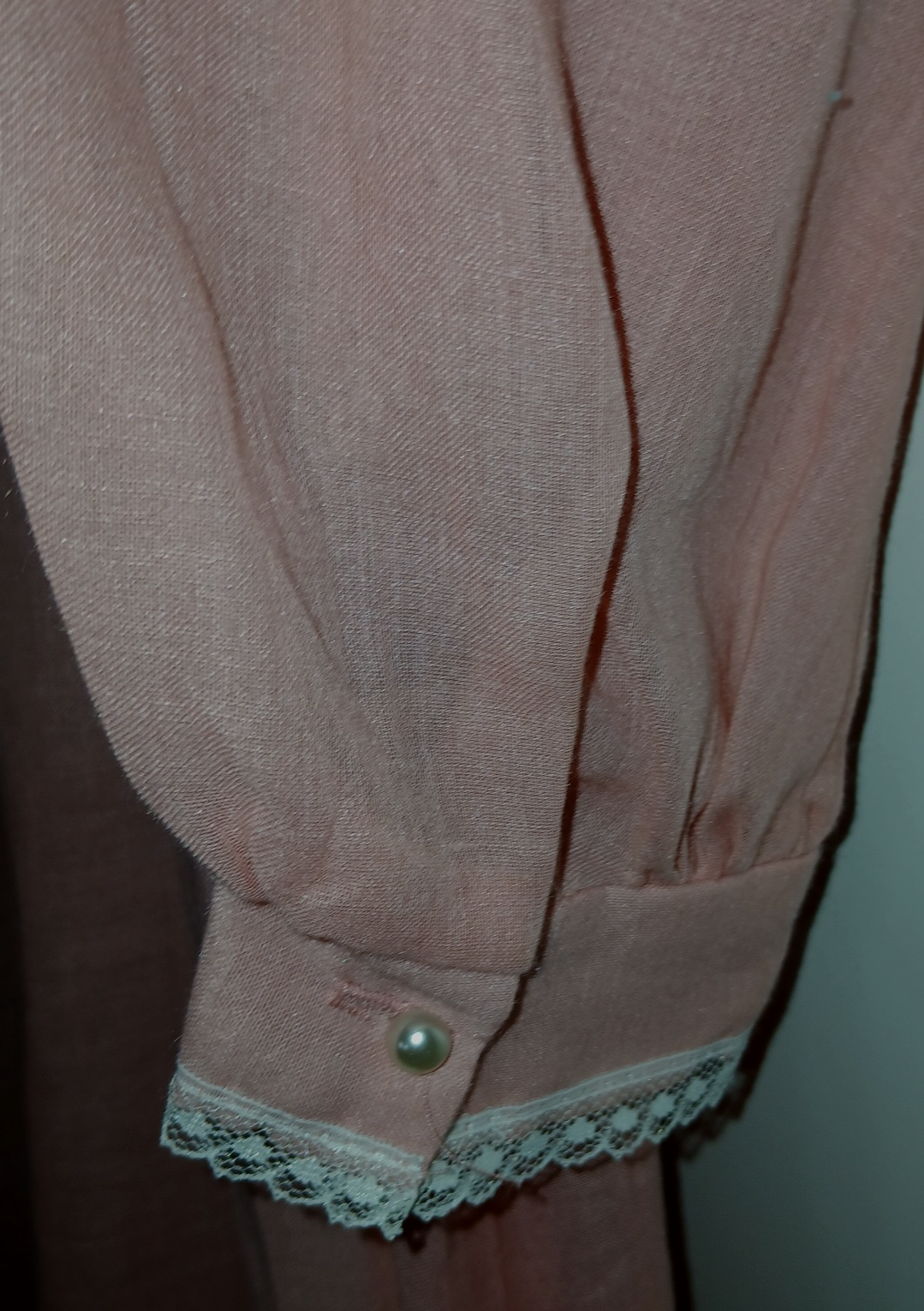 TINY PEARLS AROUD NECKLINE AND DOWN THE FRONTS WHERE THE LACE IS