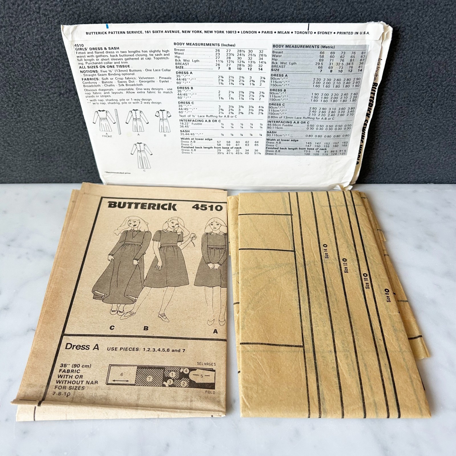 Vintage Butterick sewing pattern #4510 is uncut. Girl's fitted and flared dress in two lengths with sash. Sizes 7-14.
