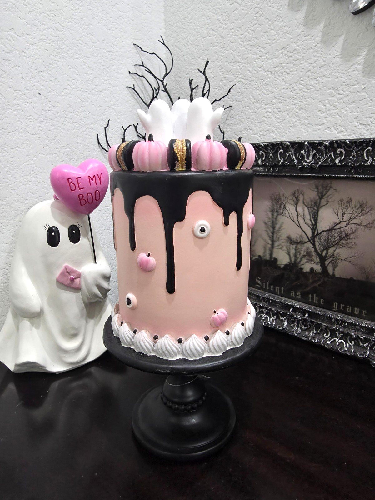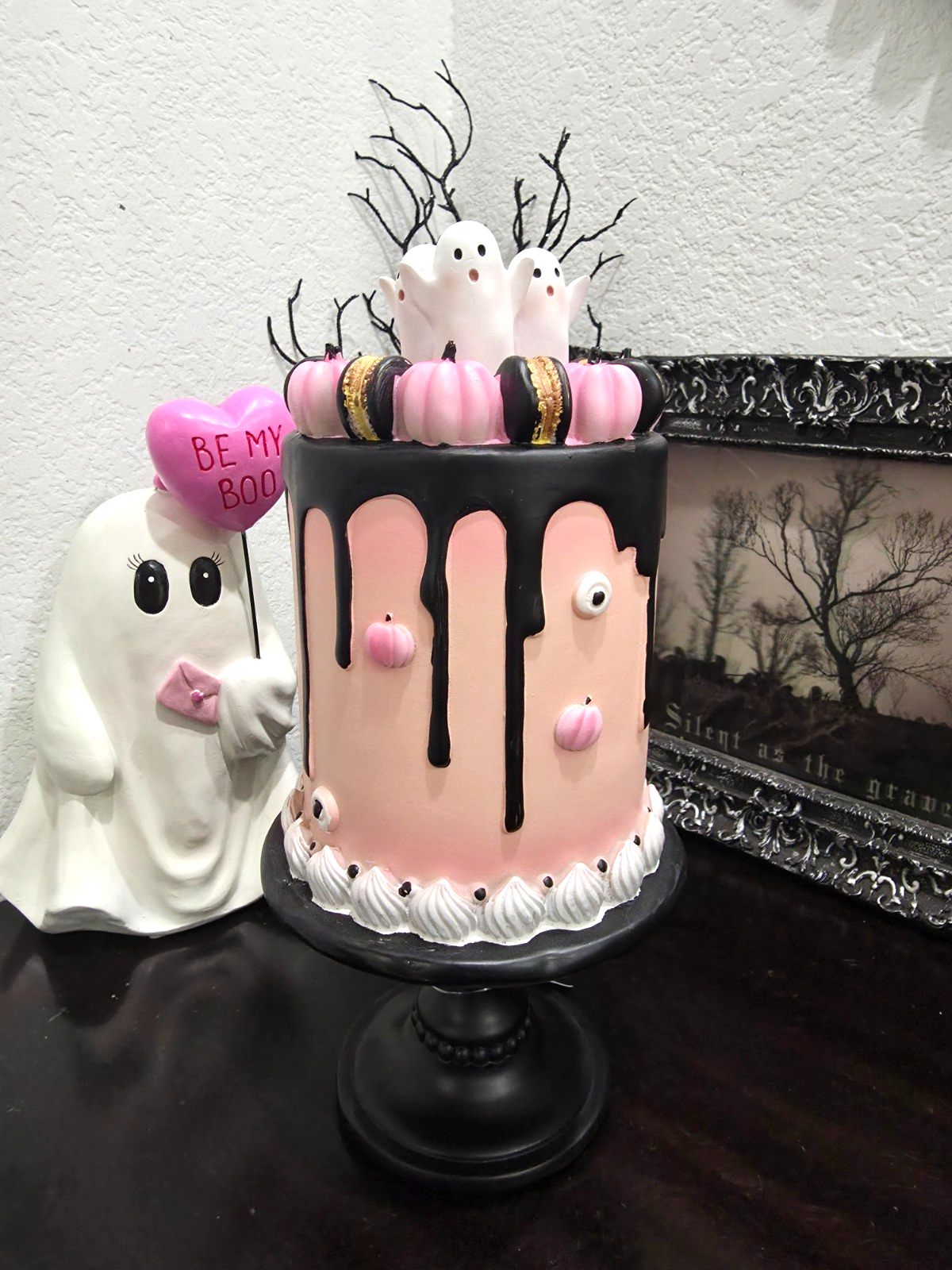 Up for sale we have this adorable pink ghost cake to add to your Halloween decor. The cake has ghost, macaroons and eyeballs. It's made of resin and stands approx 13" tall. NEW