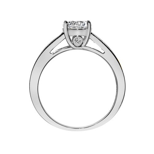 This classic engagement ring showcases a timeless design with a radiant round-cut center stone. The center stone is beautifully accented by smaller, sparkly princess-cut stones, channel set on each side. Crafted in 14k white solid gold, this ring exudes warmth and elegance.