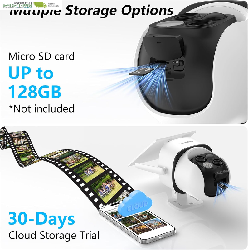 Local/Cloud Storage Works with Alexa: This outdoor camera supports up to 128GB of SD card storage (not included) to record every important moment, such as package deliveries suspicious activity. Optional cloud storage is also available for automatic backup of important videos to prevent loss. This wireless cameras for home security works with Alexa assistant, you can view real-time footage instantly using voice commands. Day or night, this solar-powered camera keeps your home safe.