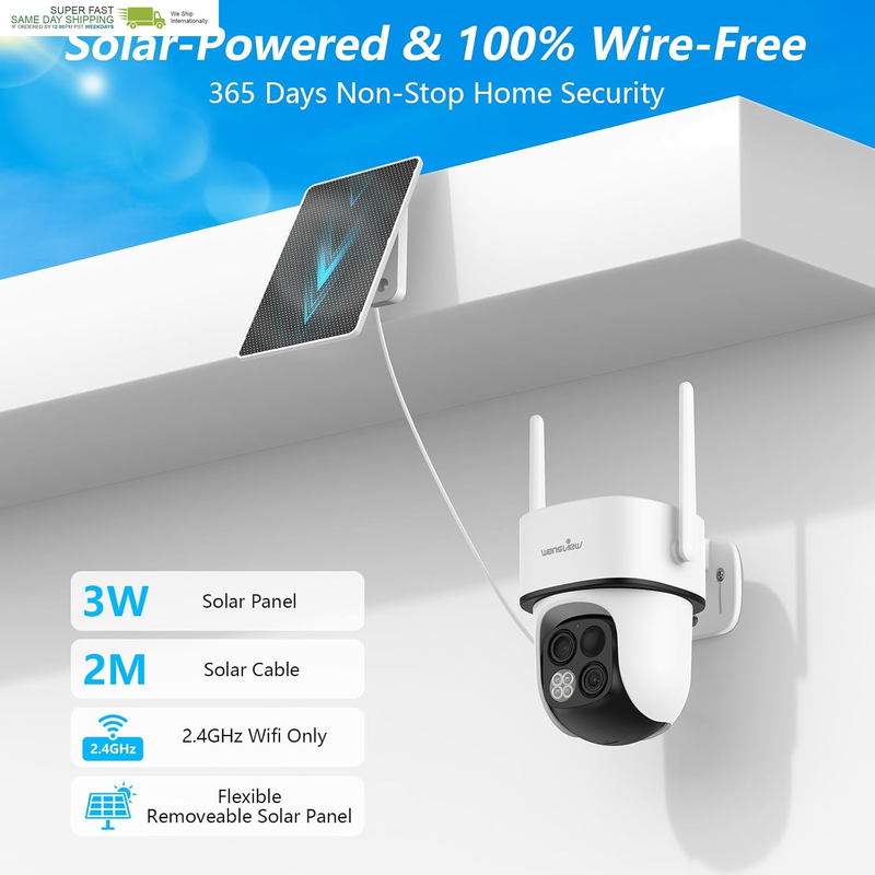Non-Stop Solar Power Easy Set up: This wireless outdoor camera works 365 days a year without the need to replace batteries, giving you peace of mind. The removable solar panel ensures that the home security cameras are charged indefinitely, so you can place it anywhere around your property without worrying about power outlets, providing you with reliable home security all year round. Quick and easy installation in less than 5 minutes via a 2.4GHz WiFi connection. ( 5Ghz not supported )