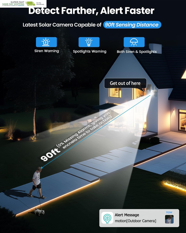[90FT Ultra-Long Detect Distance] Experience comprehensive security monitoring with the ultra-long detect distance up to 90ft, which is 3x farther than other solar security cameras, giving you more time to take action. Always be the first to spot a moving target so that intruders don't even have a chance to get near your front door. Detect farther, alert faster