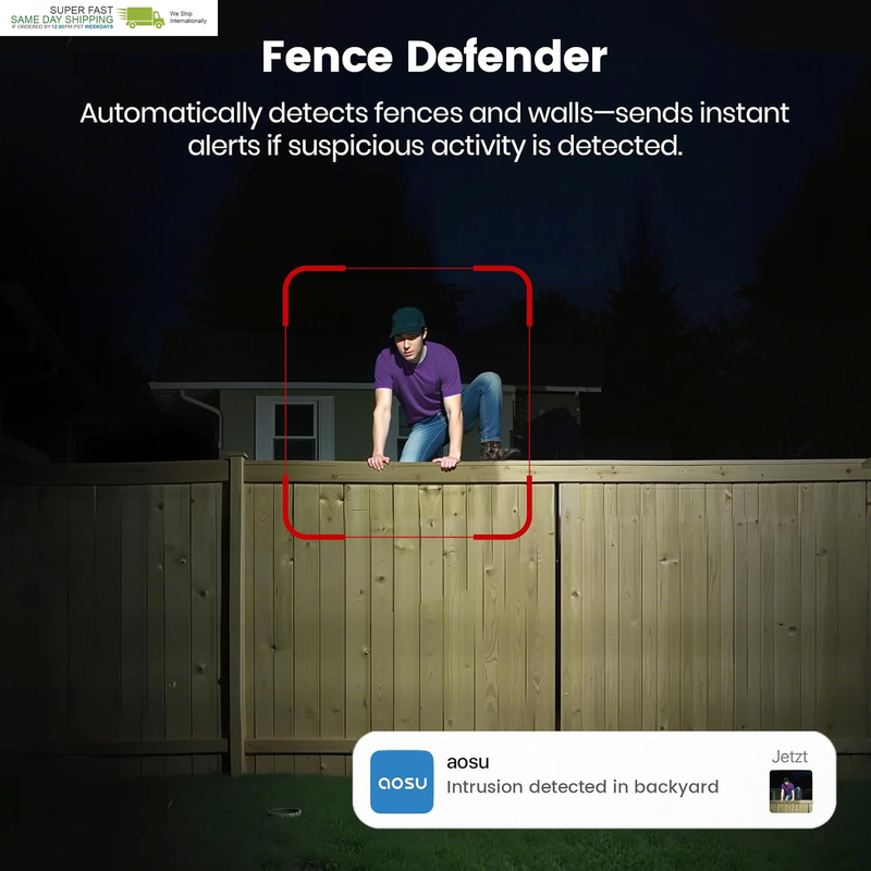 Smart Fence Perimeter Alarm System: Powered by AI, the wireless security camera automatically detects fences, walls, and vehicles to create a virtual perimeter. If an intrusion is detected, you?ll receive real-time alerts in seconds?keeping your property protected at all times.