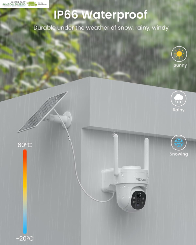 [Solar Powered 100% Wire-free] VIZIUUY solar camera security outdoor has a large capacity battery built in to provide continuous power for security cameras wireless outdoor with high conversion rate solar panel. Further, when the solar security camera is turned off, it will automatically switch on with saved power, thereby reducing downtime for charging