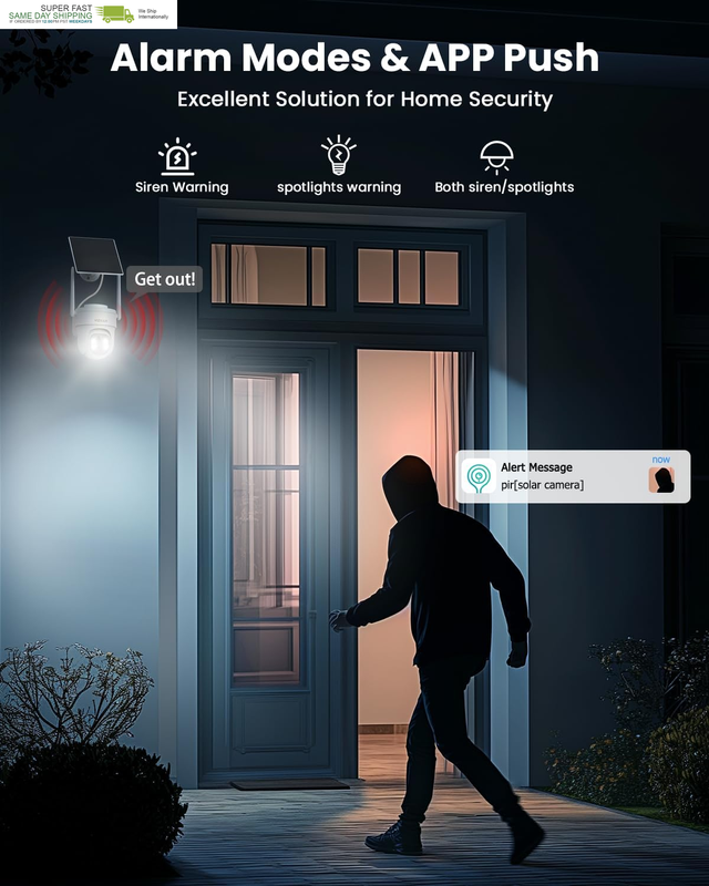 [APP Push Audio Warning Strobe Lights] The security cameras wireless outdoor offer 3 alarm types: siren, spotlights, and app push. Deter unwanted visitors with warning spotlights at night and playback caught video clips as evidence from a micro memory card (up to 128GB, not included) or cloud storage (6s free playback). You can also have a talk in real time with two-way audio