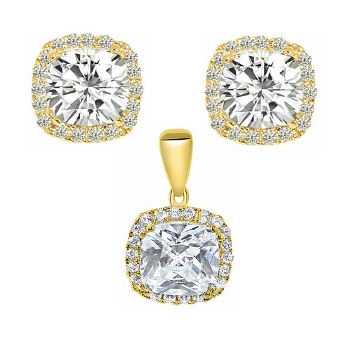 This elegant earring and pendant necklace set features genuine 14K white gold, showcasing a pair of earrings and a matching pendant, both adorned with cubic zirconia. The earrings highlight a cushion-cut cubic zirconia at their center, encircled by a halo of round-cut cubic zirconia, and secure with butterfly closures. For enhanced visual appeal, the pendant mirrors this design with its own central cushion-cut cubic zirconia, surrounded by a halo, measuring approximately 1/3 inch long.