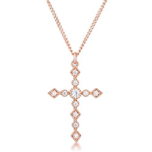 Rose Gold Plated Brass Women's Cubic Zirconia Art Deco Cross Pendant Necklace