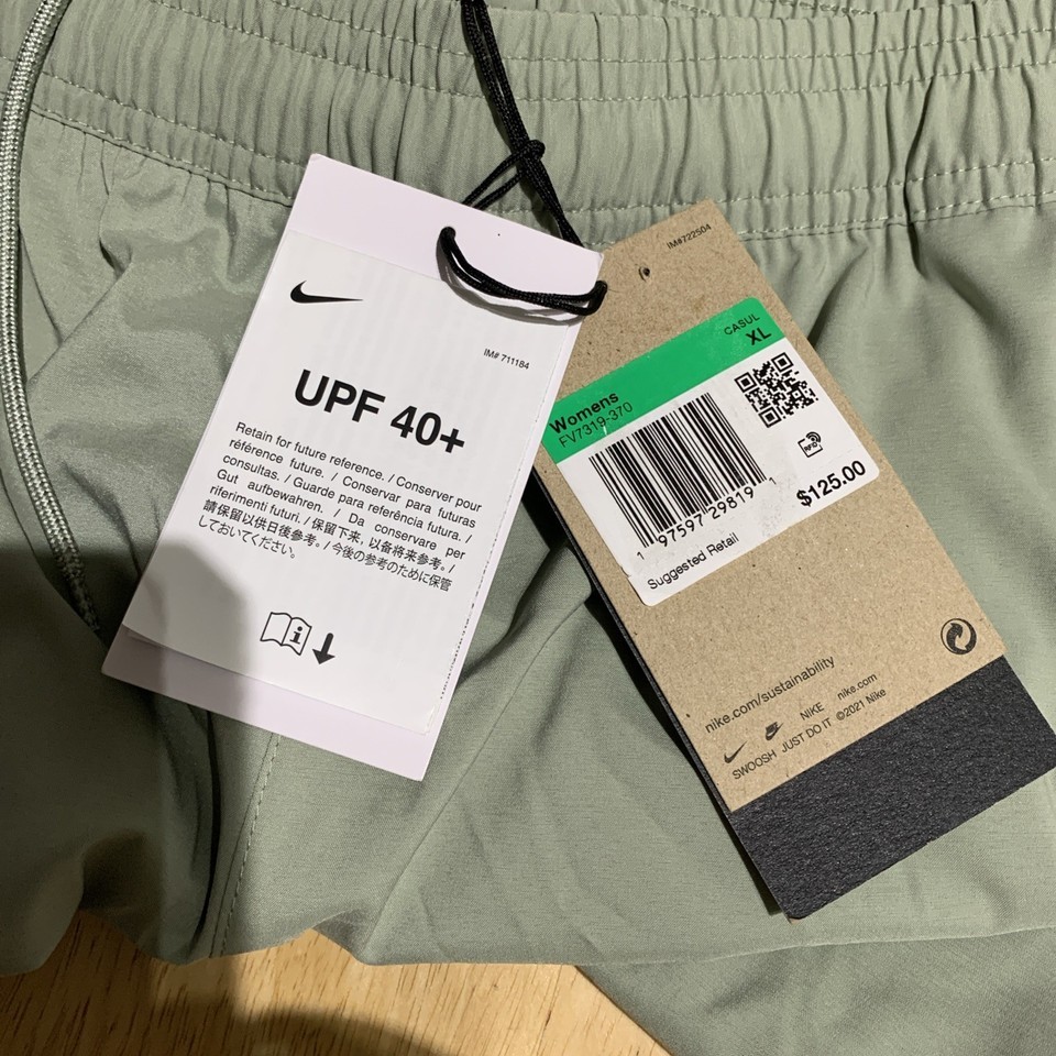 Crafted for the outdoor enthusiast, the Nike ACG Women?s XL ?Activitorium? High-Waisted UV Pants blend functionality with style. The green khakis feature a comfortable elastic waist with a lightweight, breathable polyester blend fabric that's ideal for a range of activities including walking, hiking, and climbing. With a relaxed fit and straight leg style, these pants offer ample movement and are equipped with convenient pockets, a zip pocket for secure storage, and are machine washable for easy care.