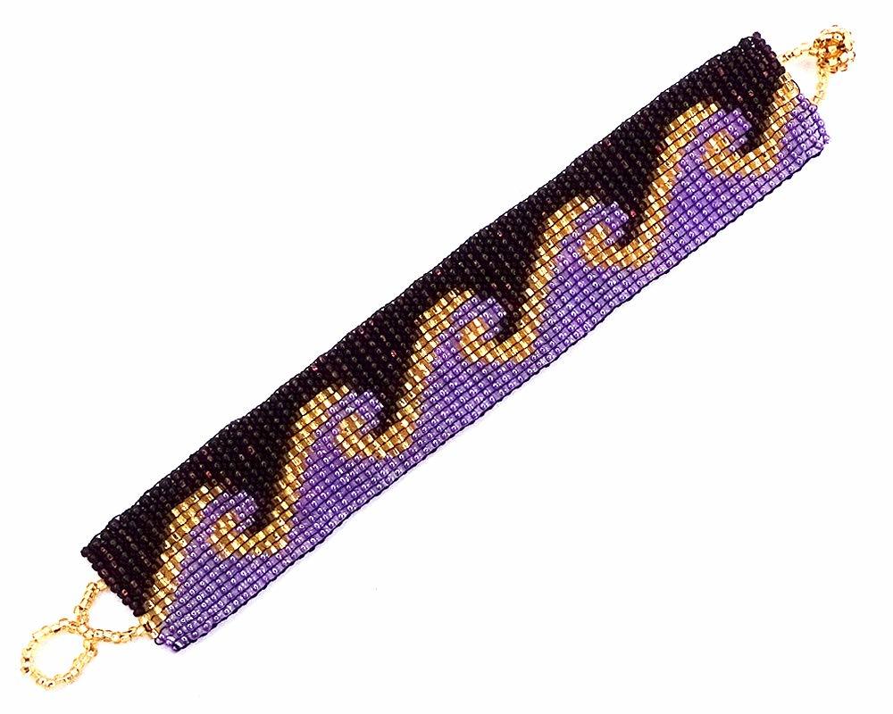 Czech glass seed bead wide strap bracelet with wave pattern design.