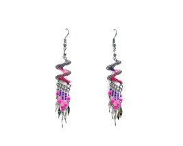 Product description: Spiral-shaped silk thread earrings with long seed bead and alpaca silver metal dangles.