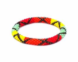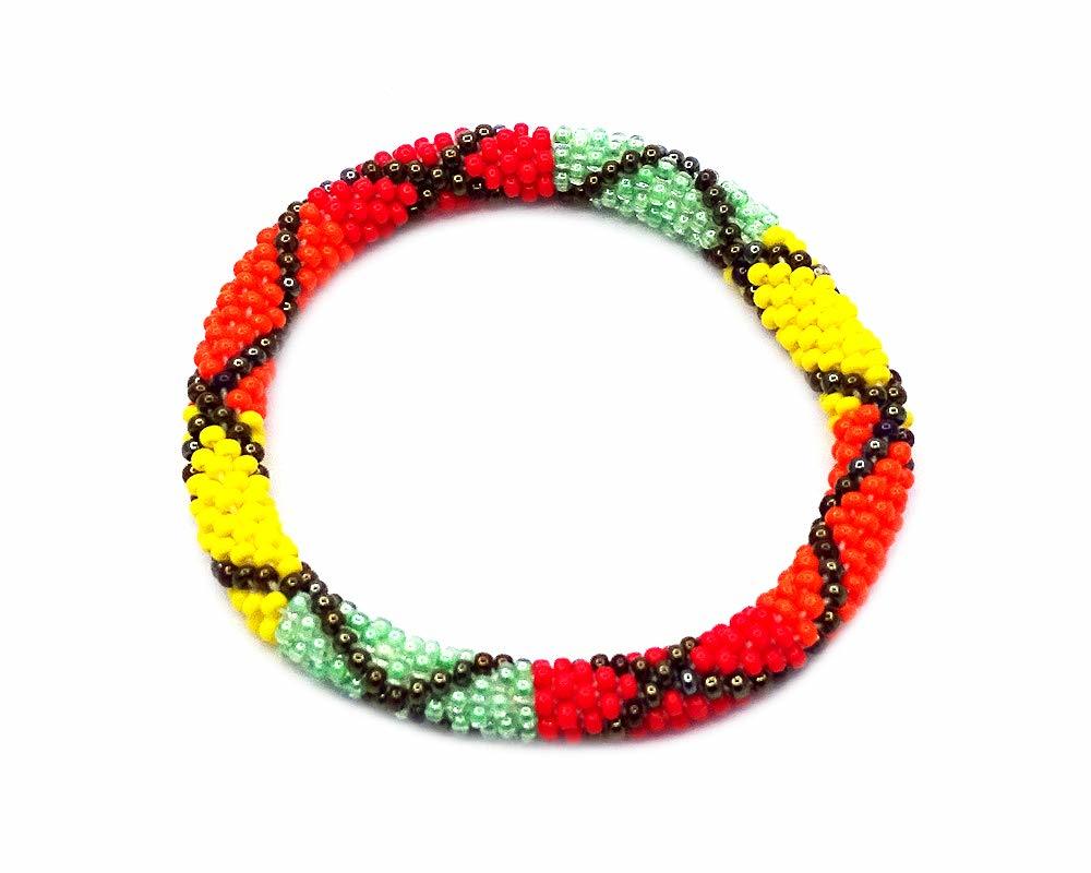 Product description: With extraordinary skill and patience, these bangles were crafted by hand, one seed bead at a time. This fashionable bracelet shines with vibrant colors and will illuminate your outfit.