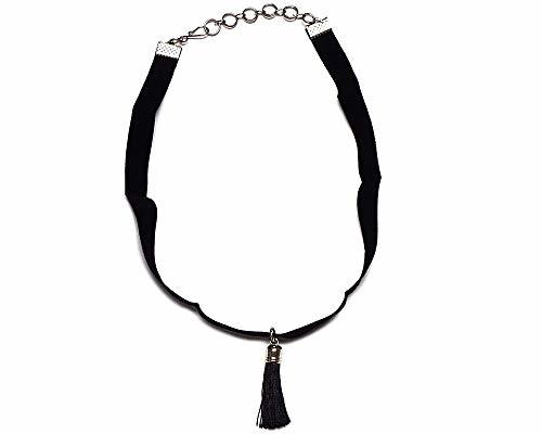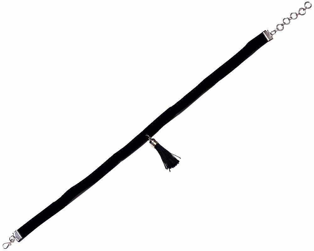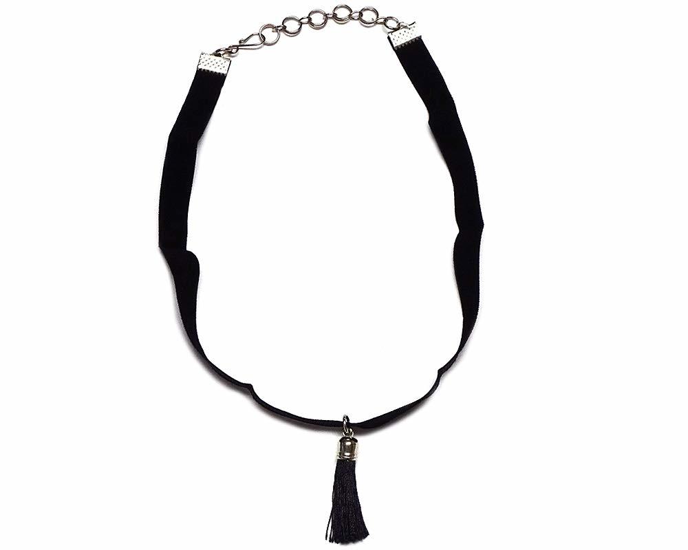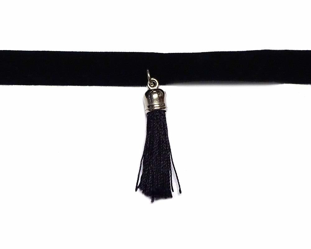 Black velvet ribbon choker necklace with silver metal and silk thread tassel dangle in solid colors.