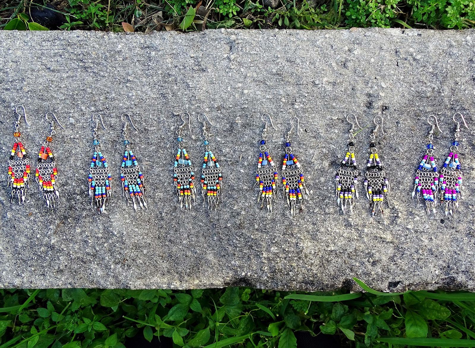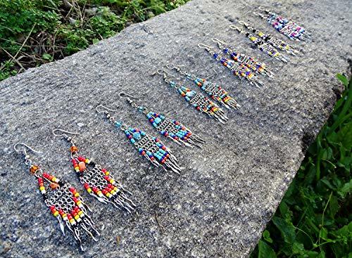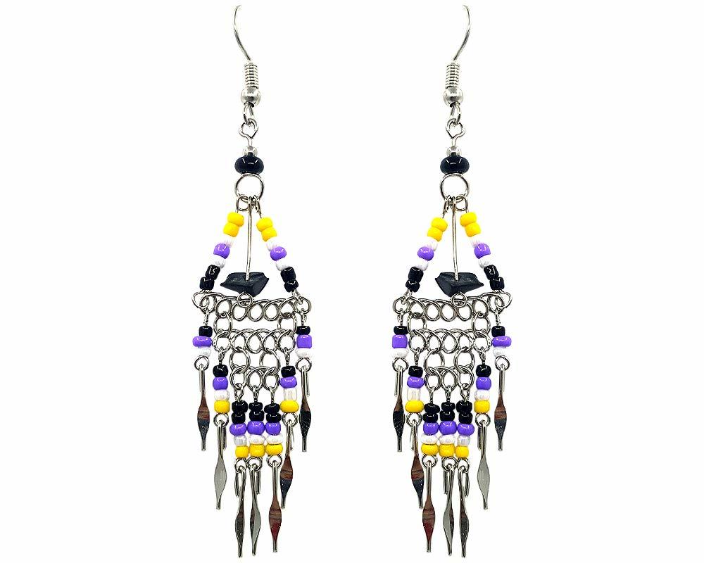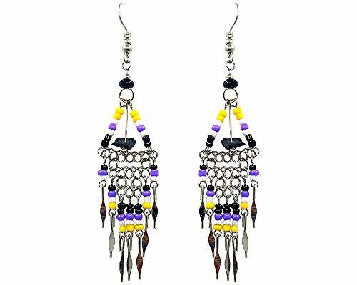 Chip stone in seed bead triangle hoop with long beaded silver chain dangles in Native American inspired color scheme. Express your love for handcrafted arts and culture with our colorful ethnic Native American inspired collection.