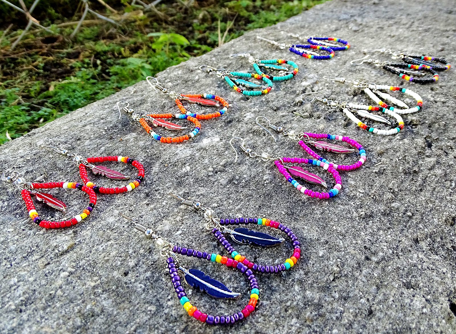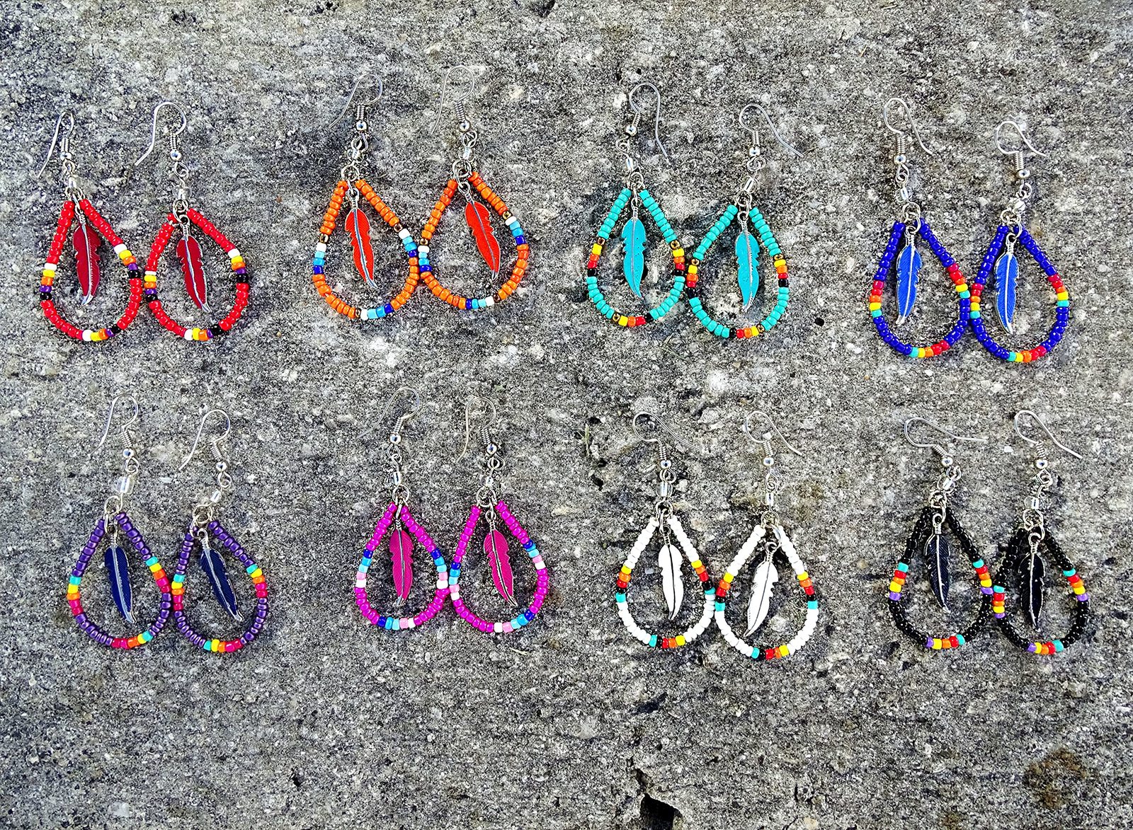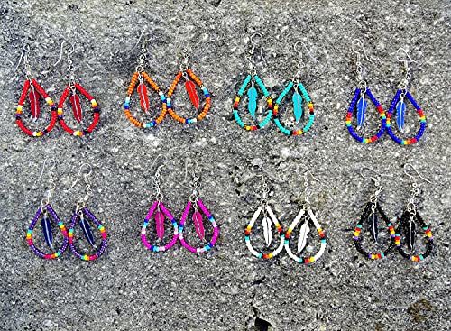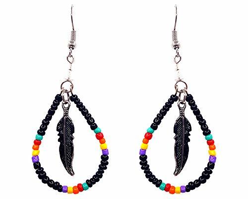 Native American Inspired Teardrop Shaped Seed Beaded Hoop Metal Feather Charm Da