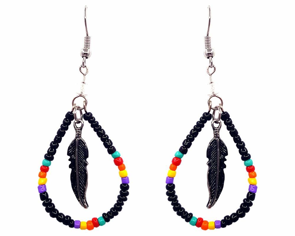 Teardrop-shaped seed bead hoop earrings with colored metal feather charm inner dangle in Native American inspired color combination.