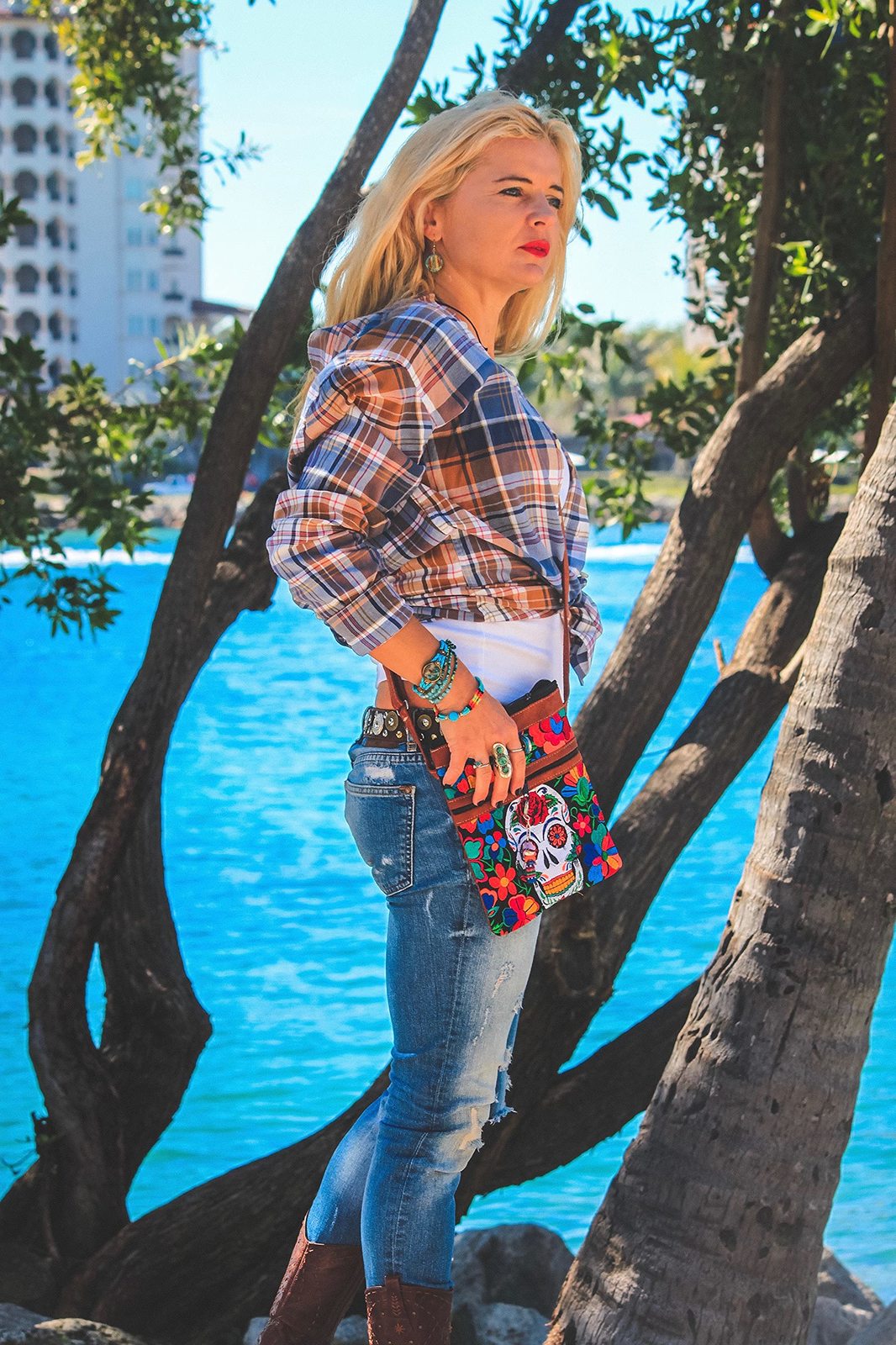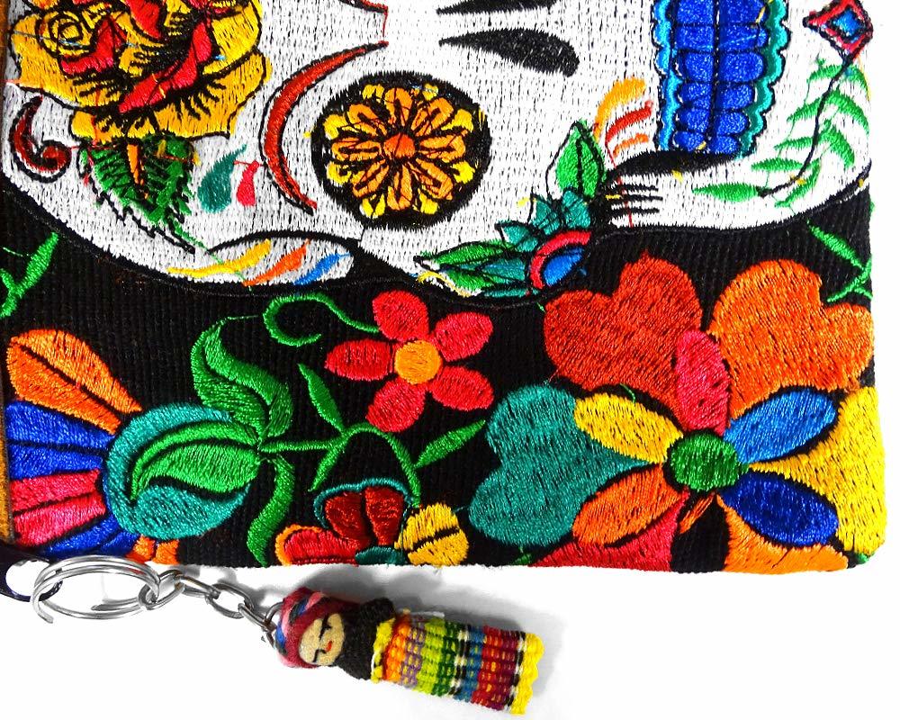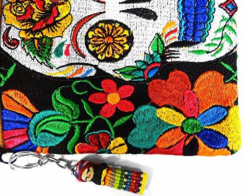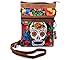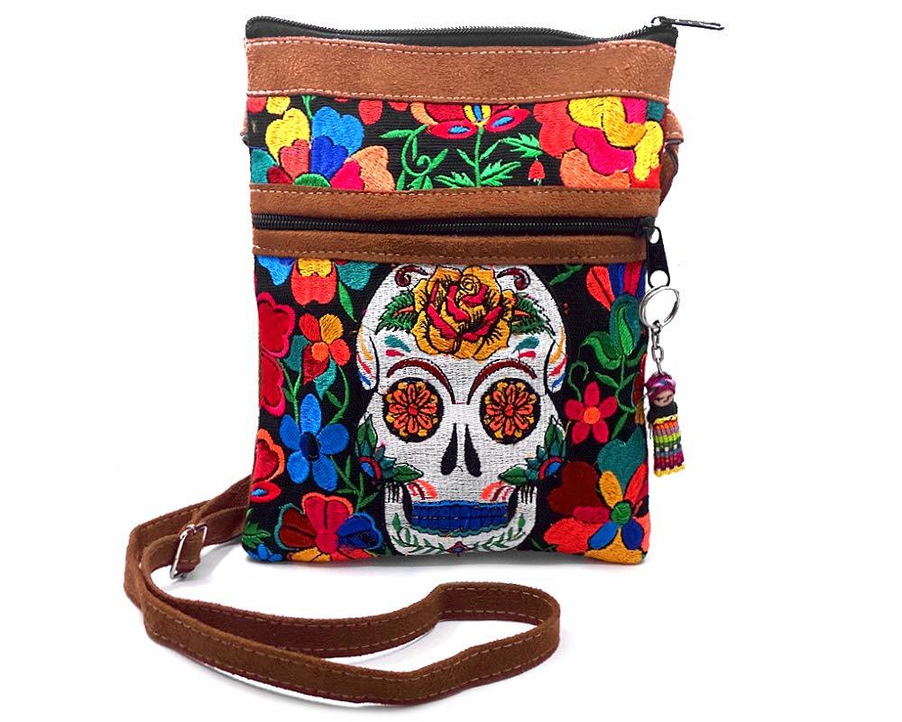 Medium-sized slim rectangle-shaped crossbody purse bag with multicolored embroidered Day of the Dead sugar skull and floral designs, brown vegan leather suede, and worry doll keychain.