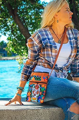 Sugar Skull Floral Embroidered Brown Vegan Leather Suede Slim Purse Crossbody Ba