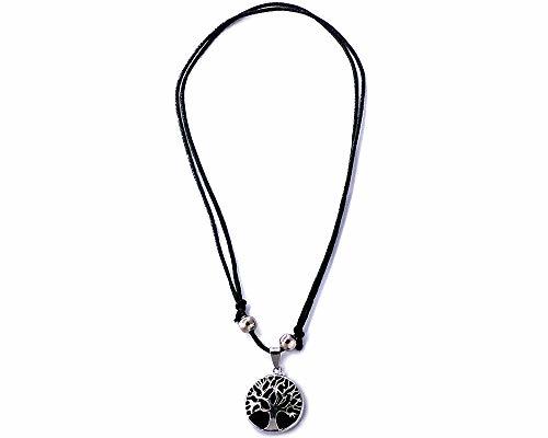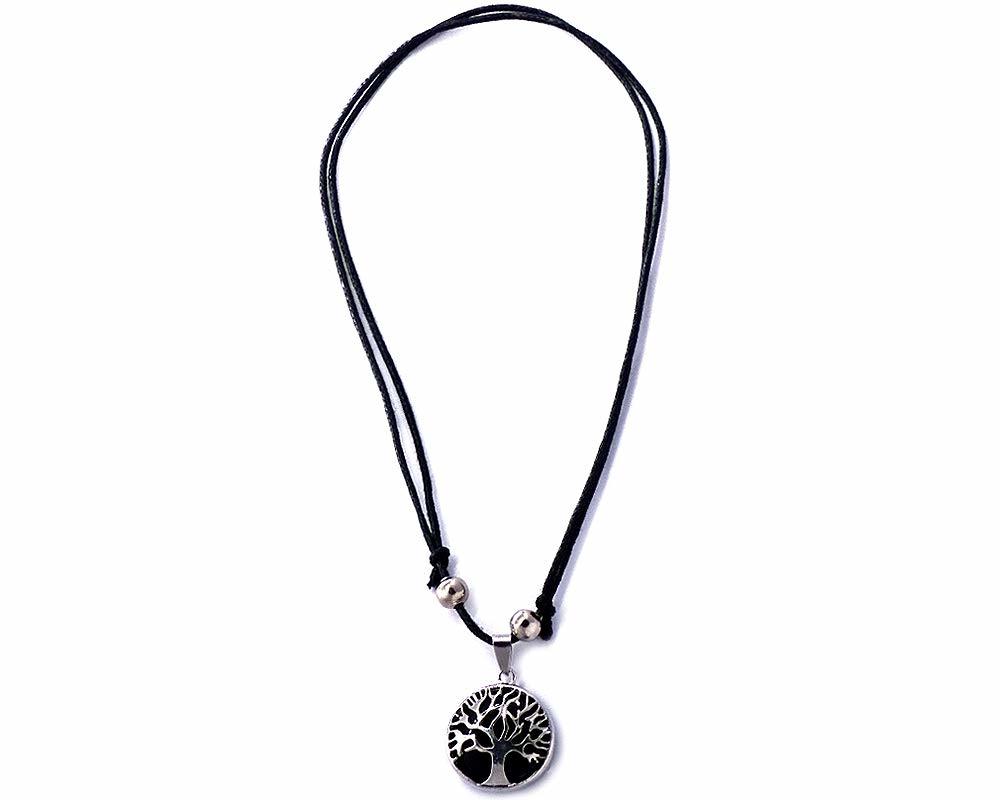 Round-shaped gemstone cabochon crystal pendant with silver metal tree of life design on adjustable necklace.