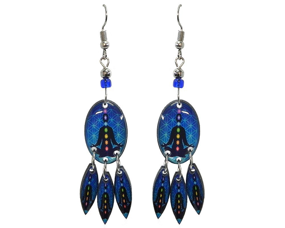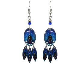 Oval-shaped New Age themed graphic acrylic earrings with long matching dangles and beaded metal hooks. Available in different metaphysical themes and artistic graphic designs. Dimensions: approximately 3 inches x 0.6 inches x 0.3 inches Weight: 0.1 oz. Materials: Acrylic, Seed bead, Stainless steel Stainless steel hooks are hypoallergenic and lightweight for a comfortable fit. Tested for non-toxic materials. Handmade in Peru.