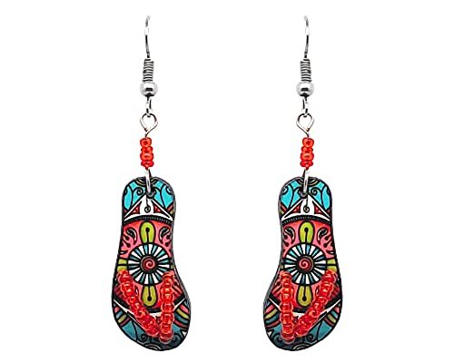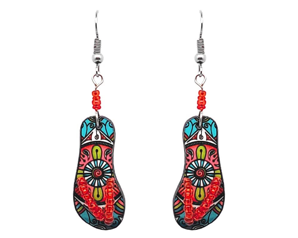 Product description: Acrylic flip flop sandal earrings with seed bead straps and beaded hooks. Assorted vibrant, tropical, and beach themed patterns. Surgical steel hooks are hypoallergenic and lightweight for a comfortable fit. Tested for non-toxic materials. Handmade in Peru.