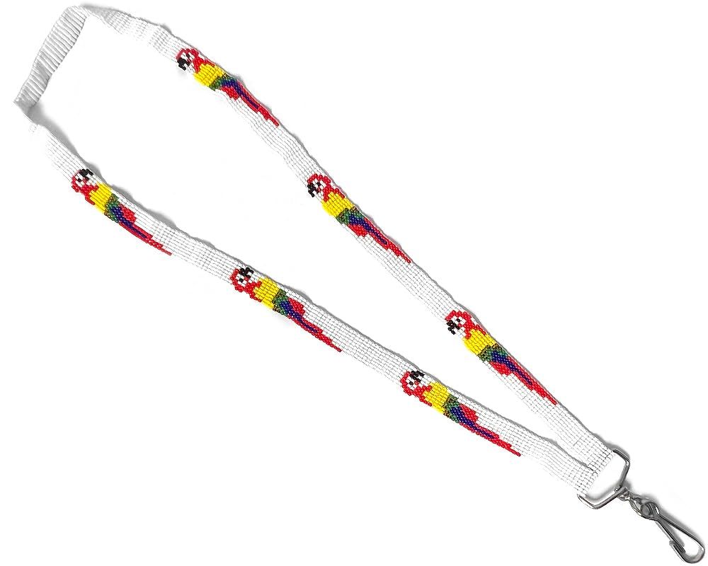 Czech glass seed bead wide strap lanyard with multicolored parrot bird pattern design and silver metal swivel hook clasp. Dimensions: approximately 20 inches x 1.3 inches x 0.5 inches, 34 inches (Circumference) Weight: approximately 1.5 oz. Guatemalan natives carefully craft each one of these treasures with Czech glass seed beads, one bead at a time. Creative, vibrant, and glimmering variety of beaded patterns and colors to suit your preference. 1.5" stainless steel swivel hook clasp attached. Securely holds keys, keychains, badges, etc. Handmade in Guatemala.